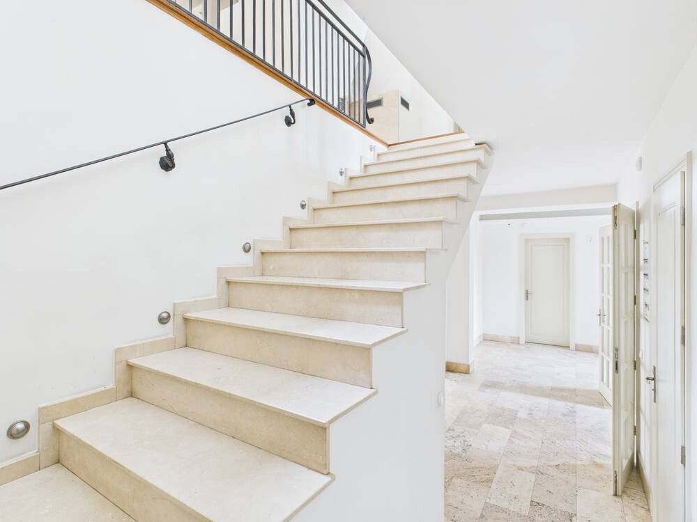 2 upper-floor apartments - with bathroom with shower, kitchenette, and built-in wardrobes for domestic staff. The second apartment serves as a "guest room" with small kitchenette and bathroom with shower, or as a teenager's apartment. Ground floor: 2 garages accommodating 3 vehicles, utility room. Adjacent granite-paved driveway for approximately 10-12 cars.