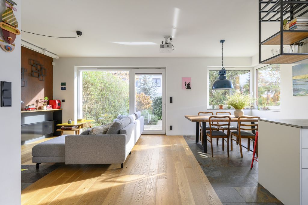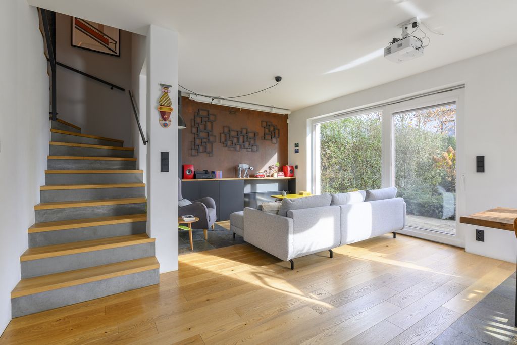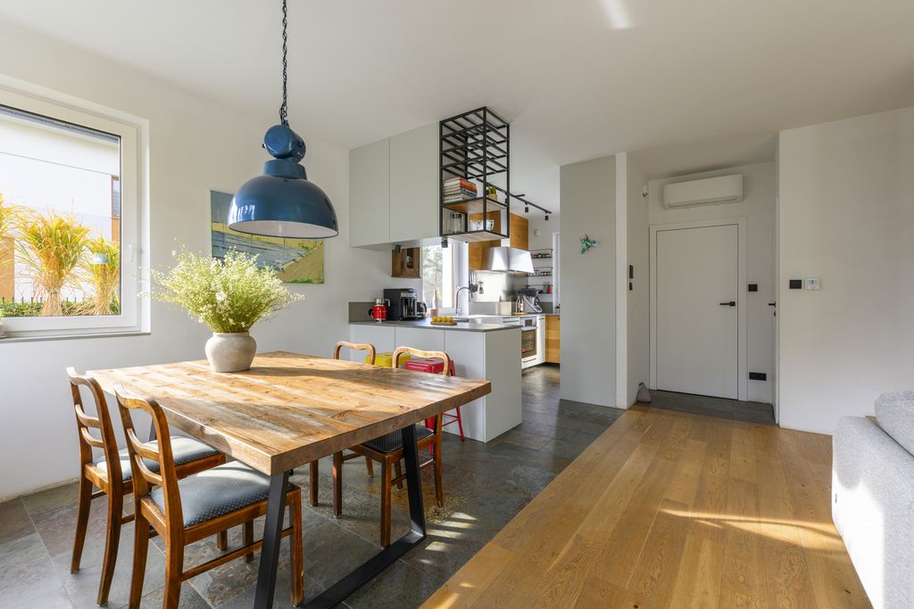 - Jasny układ dzienny: salon z jadalnią płynnie wychodzi na taras i ogród.