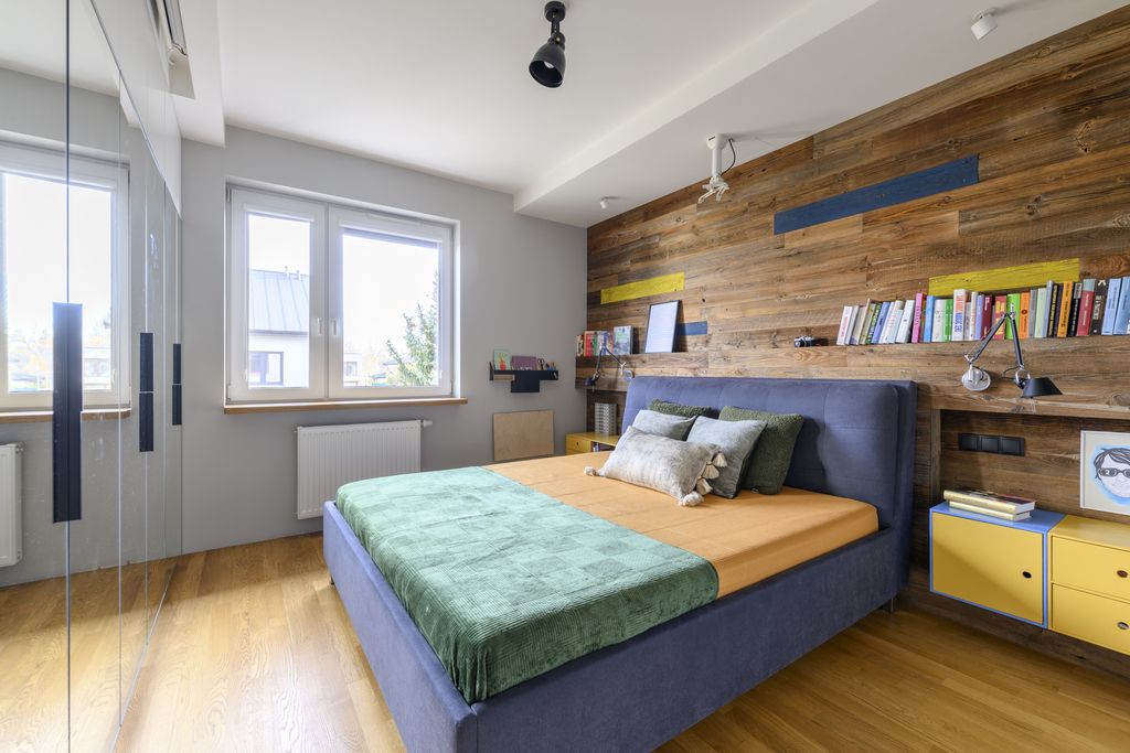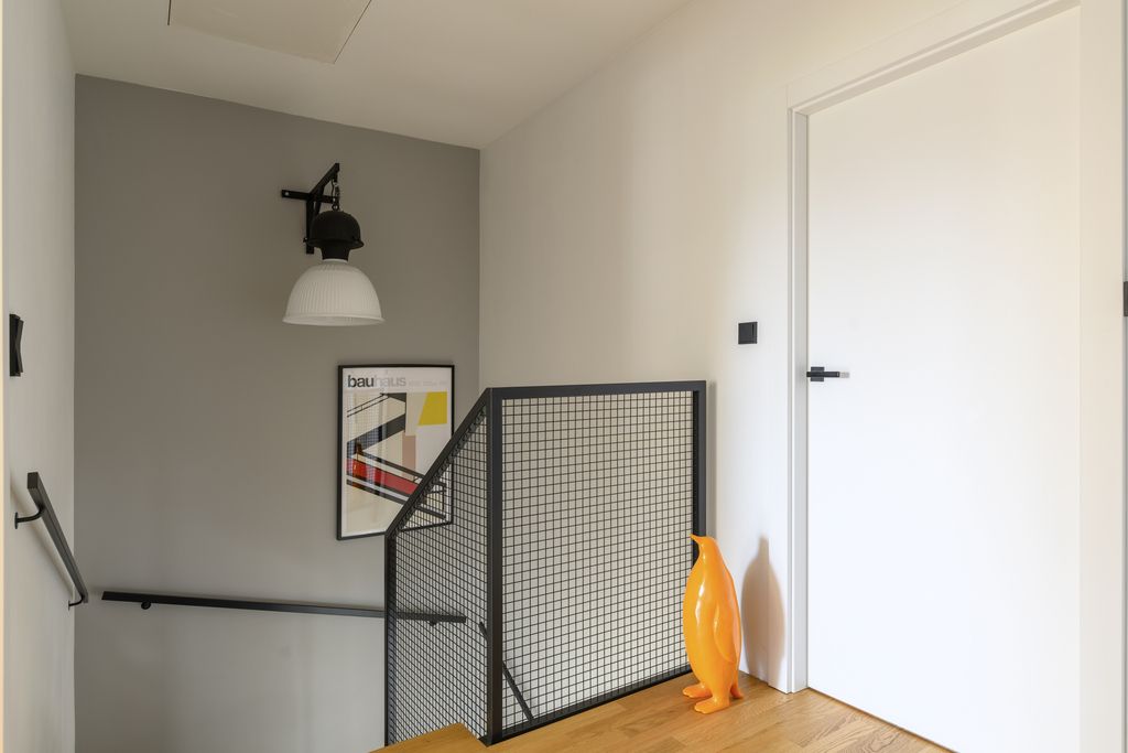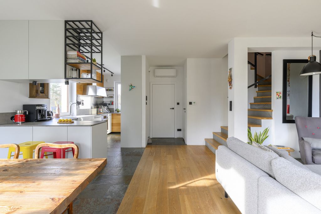 - Wykończenie: dębowy parkiet i łupek na parterze; dębowy parkiet i gres w łazience na piętrze.
