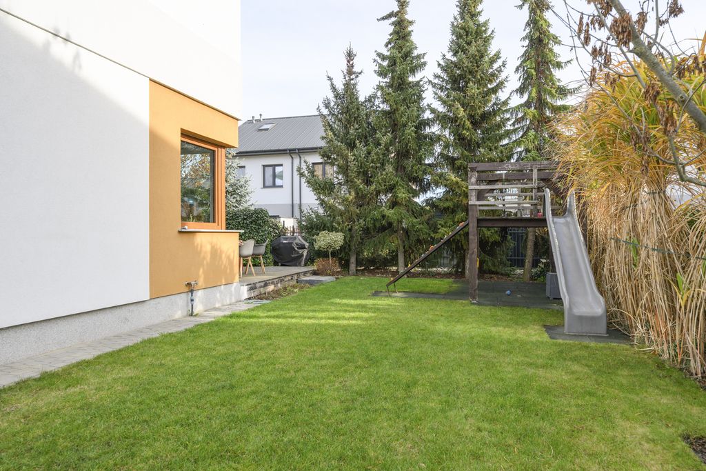 - Zadbany ogród: drewniany taras, pełne nawodnienie, oświetlenie, projekt zieleni zapewniający prywatność, wydzielona strefa grilla, huśtawka i ściana wspinaczkowa dla dzieci.