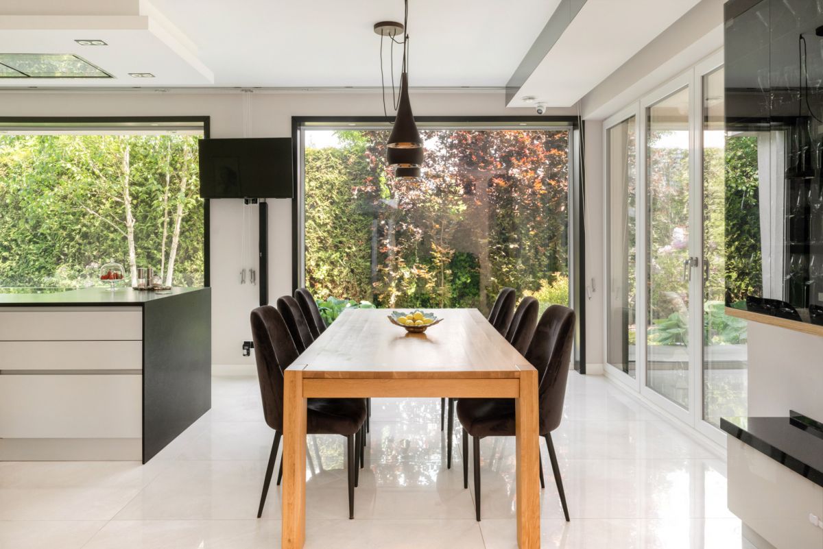 • Salon 90 m² z panoramicznymi drzwiami tarasowymi HS na całą ścianę