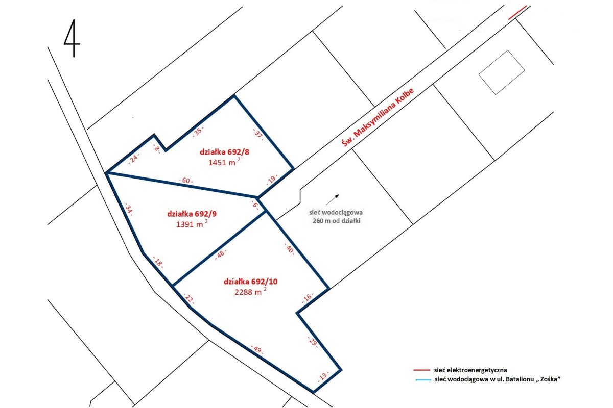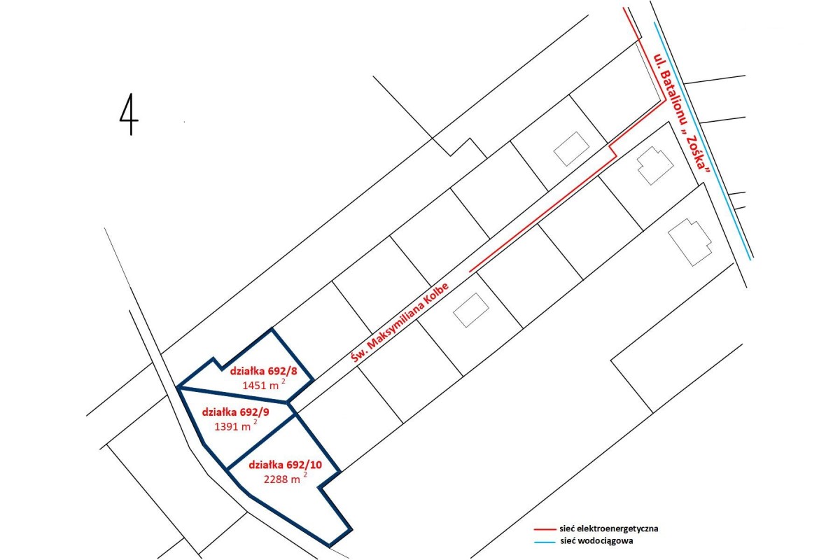 Ulica św. Maksymiliana Kolbe biegnąca przy wydzielonych działkach zakończona jest tzw. zawrotką, co ogranicza ruch tylko do mieszkańców i ich gości. Sąsiedztwo rzeki oraz terenów zielonych daje poczucie spokoju i przestrzeni.