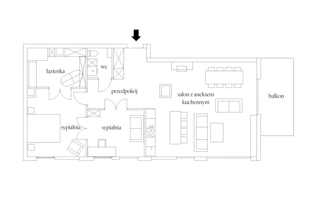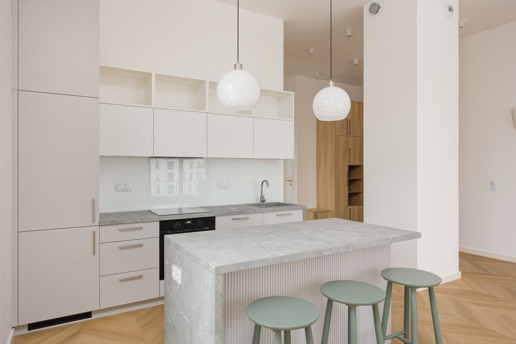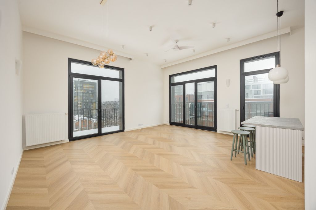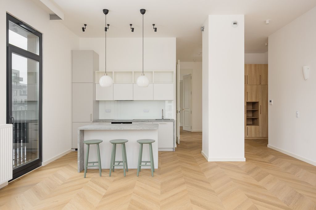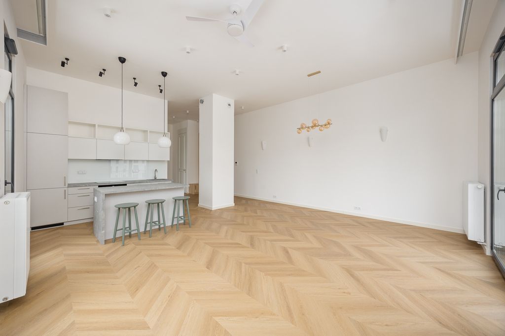 Strefa dzienna o powierzchni ponad 42 m² stanowi reprezentacyjne serce mieszkania. Wysokość 3,5 metra w połączeniu z dużymi przeszkleniami i zachodnią ekspozycją sprawia, że wnętrze jest jasne, przestronne i daje poczucie swobody, którego nie oferują standardowe mieszkania. Kuchnia z wyspą została wykonana na wymiar i w pełni wyposażona w sprzęt AGD.