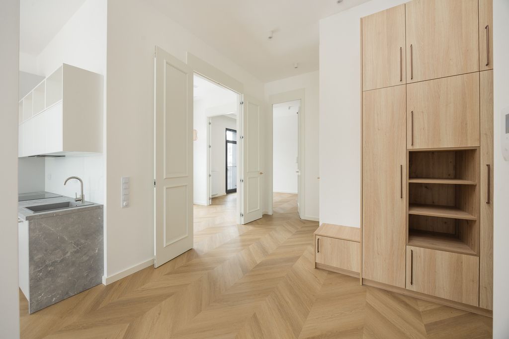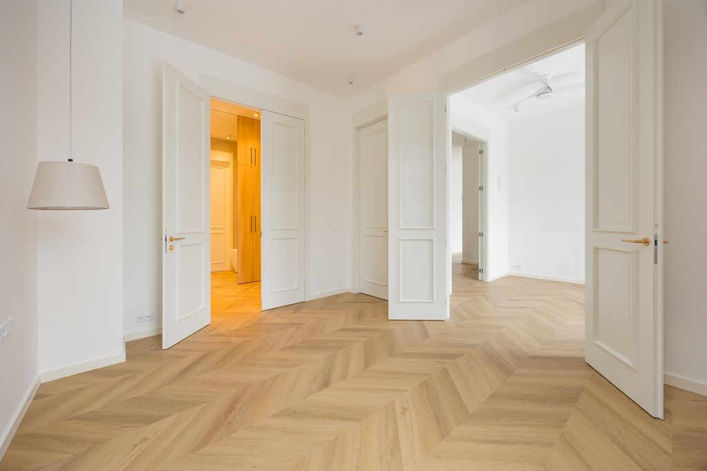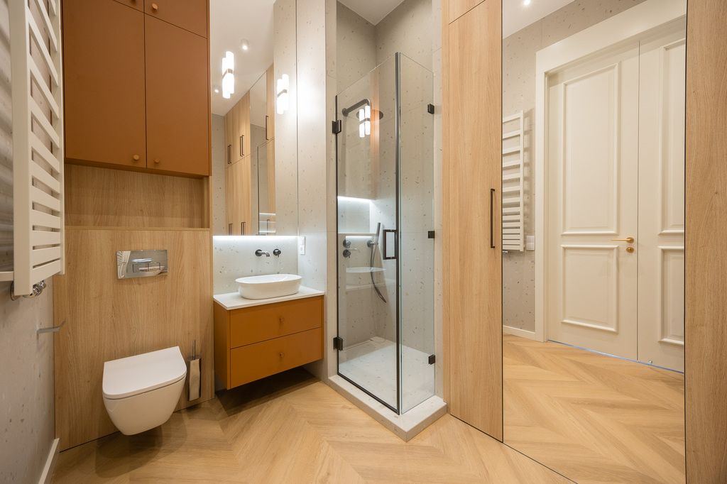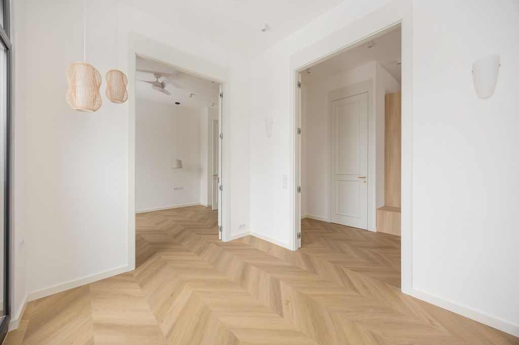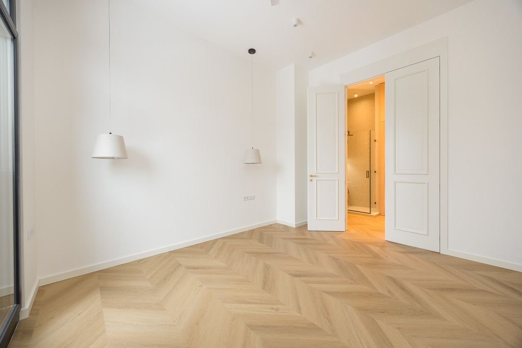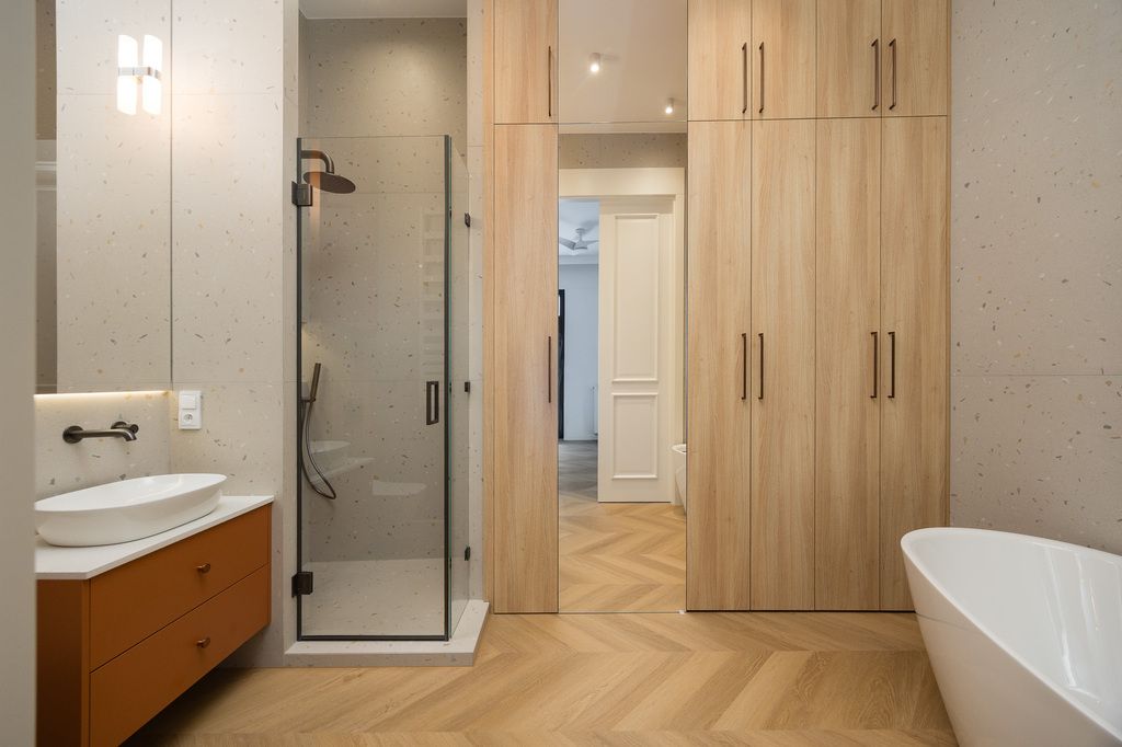 Na podłogach zastosowano panele winylowe ułożone w jodełkę, które nadają wnętrzu elegancki charakter. Zabudowy stolarskie zostały wykonane na wymiar, co pozwoliło maksymalnie wykorzystać wysokość i potencjał przestrzeni.