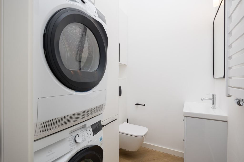 Główna łazienka została zaprojektowana jako komfortowa strefa relaksu – znajduje się tu wolnostojąca wanna oraz prysznic. Druga łazienka została wyposażona w wc, pralkę oraz suszarkę. Układ mieszkania zapewnia wyraźny podział na część dzienną i prywatną.
