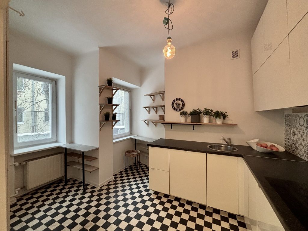 •Niezwykły klimat wnętrz — duże okna, drewniana podłoga, wysokie sufity oraz elementy zabudowy charakterystyczne dla kamienic.