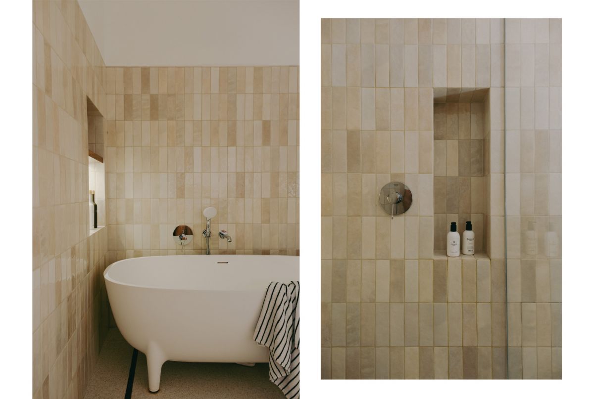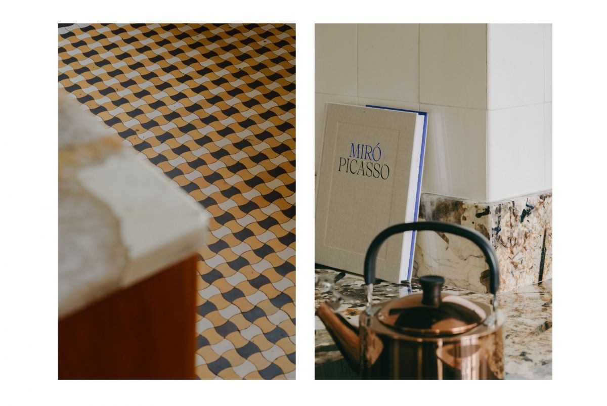Część dzienna stanowi otwartą, jasną przestrzeń z bezpośrednim wyjściem na balkon, płynnie połączoną z kuchnią, która została potraktowana jako serce domu. Rzeźbiarska zabudowa kuchenna, częściowo podwieszona, eksponuje oryginalną, przedwojenną mozaikę podłogową, starannie odrestaurowaną z zachowaniem historycznych detali. Blat wykonany z naturalnego kwarcytu Patagonia zapewnia dużą powierzchnię roboczą i sprzyja wspólnemu gotowaniu.