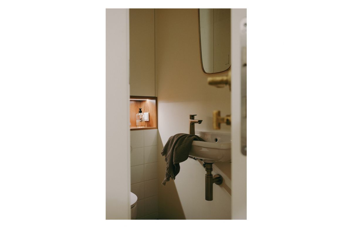 By the window, a deepened sill has been designed as an intimate breakfast table, overlooking the green courtyard of the building. The sunny exposure combined with the apartment’s distance from busy streets ensures interiors that are both bright and exceptionally quiet.