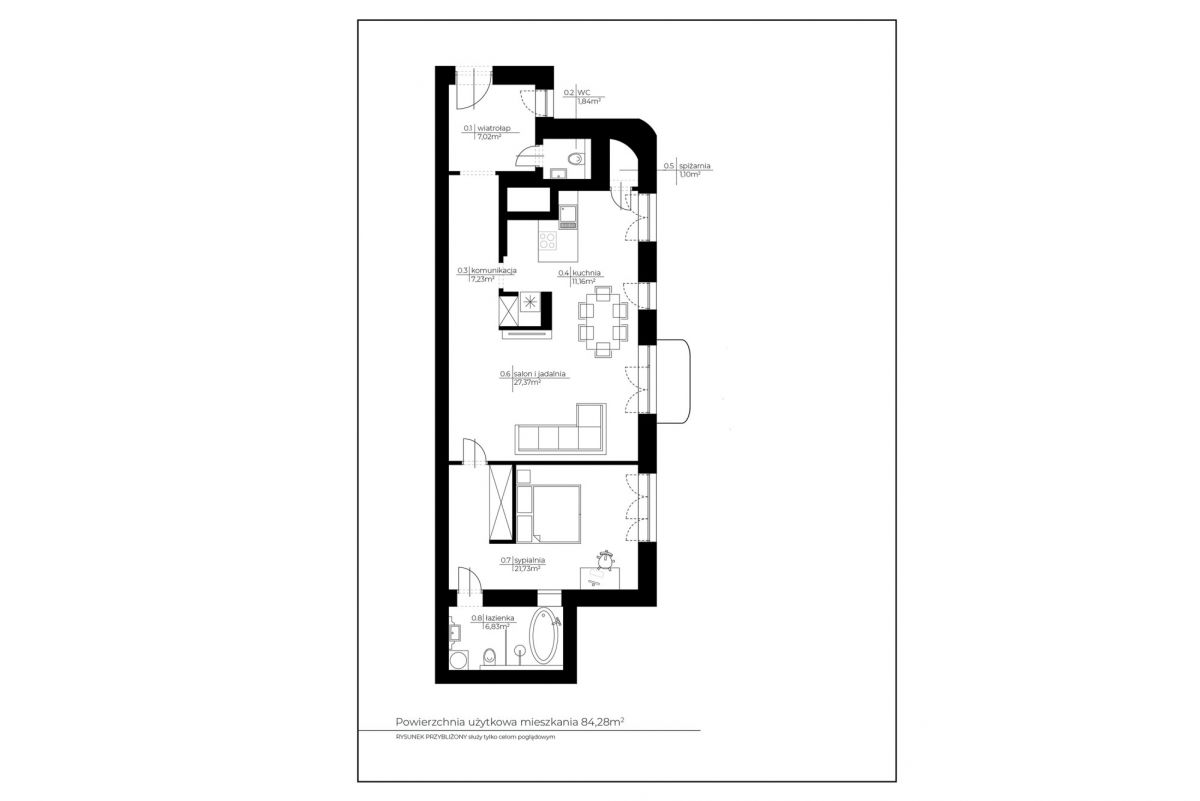 Apartament o powierzchni 83 m² został zaprojektowany i wykończony według autorskiego projektu architekt Ewy Lewandowskiej, z pełnym poszanowaniem modernistycznego charakteru budynku oraz jego zabytkowej tkanki. Układ mieszkania jest czytelny, funkcjonalny i podporządkowany komfortowi codziennego życia. Jest idealne dla użytkowania zarówno przez singla, parę, jak i jako reprezentacyjny apartament miejski.