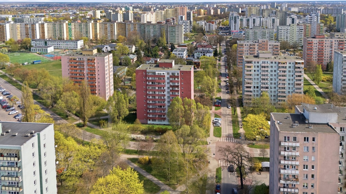 Przemyślany układ zabudowy z dużymi odległościami między budynkami zapewnia