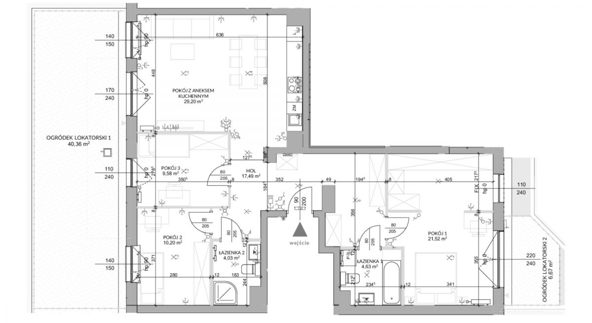- przestronną część dzienną łączącą salon z aneksem kuchennym, z wyjściem do prawie 40 m2 ogródka