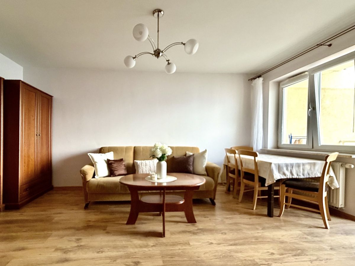 Kompletne umeblowane. W większym pokoju znajdują się liczne szafy, kanapa, fotele, komoda, duży telewizor, stół i krzesła. W mniejszym łóżko, biurko, szafa i regały na książki.