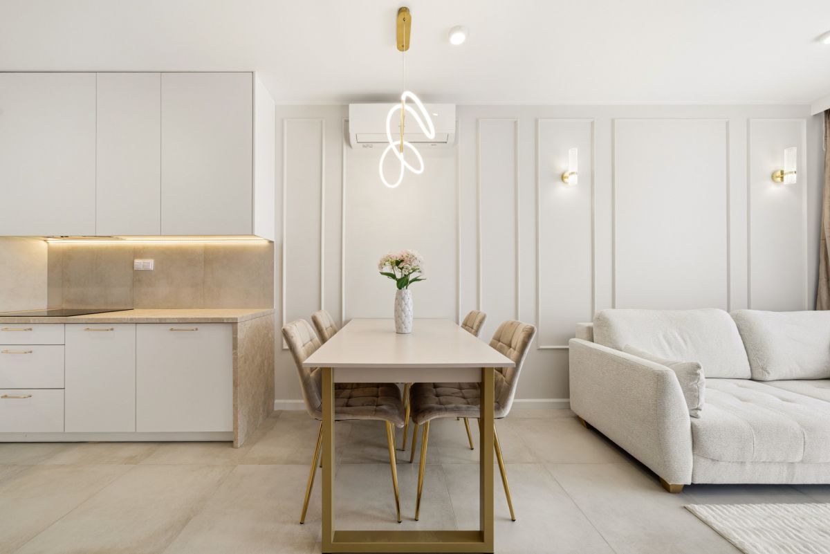 · salonu z jasną, otwartą kuchnią,