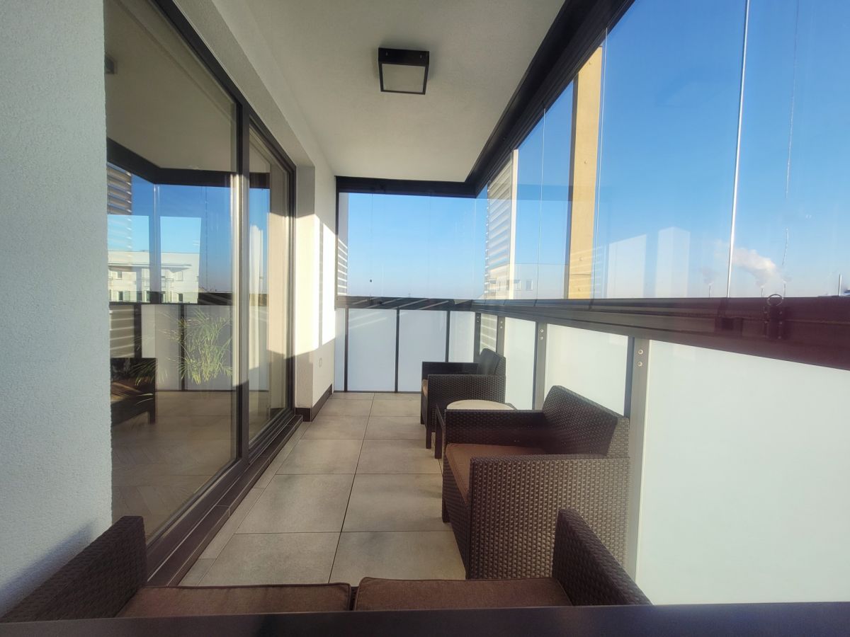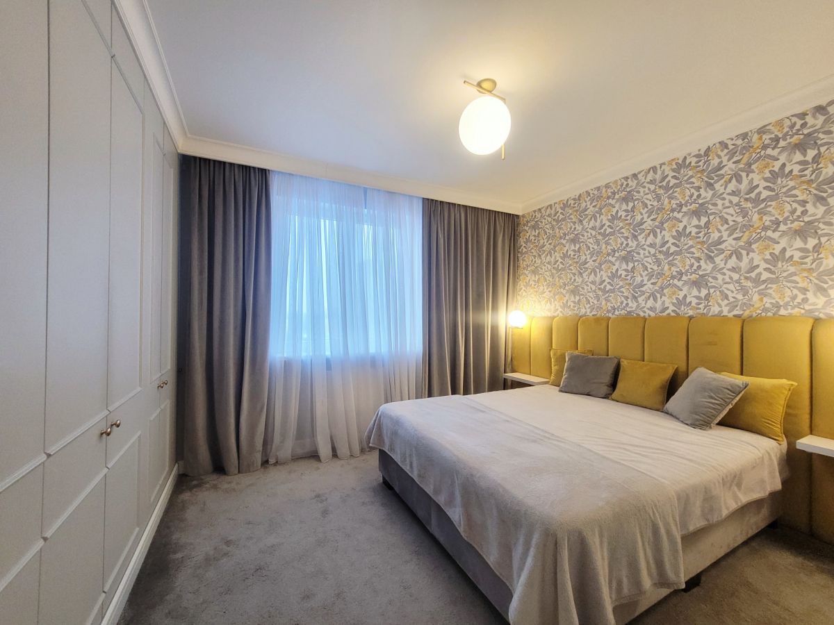 Podłoga w salonie jest z dębowego drewna, w łazience i przedpokoju jest nowoczesny gres. Ściany są w jasnej szarej kolorystyce, a dwie pojemne i doskonale rozplanowane szafy wnękowe zostały wkomponowane we wnętrze i są na pierwszy rzut oka praktycznie niewidoczne. Loggia jest wyposażona w wygodne meble, które pozwalają najemcy spędzać na niej czas. Atutem mieszkania jest jego położenie od cichej strony osiedla, dobre doświetlenie światłem dziennym, wysokość ok 3m oraz wysokie piętro z przestrzennym i ładnym widokiem. Mieszkanie pachnie czystością, a jego wnętrze zadowoli najbardziej wymagającego najemcę. Budynek jest nowoczesny, strzeżony, posiada eleganckie klatki schodowe i windę zjeżdżającą do poziomu garażu. Osiedle jest monitorowane, objęte ochroną, co zapewnia mieszkańcom wysoki poziom bezpieczeństwa oraz komfortu.