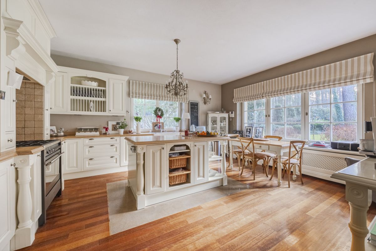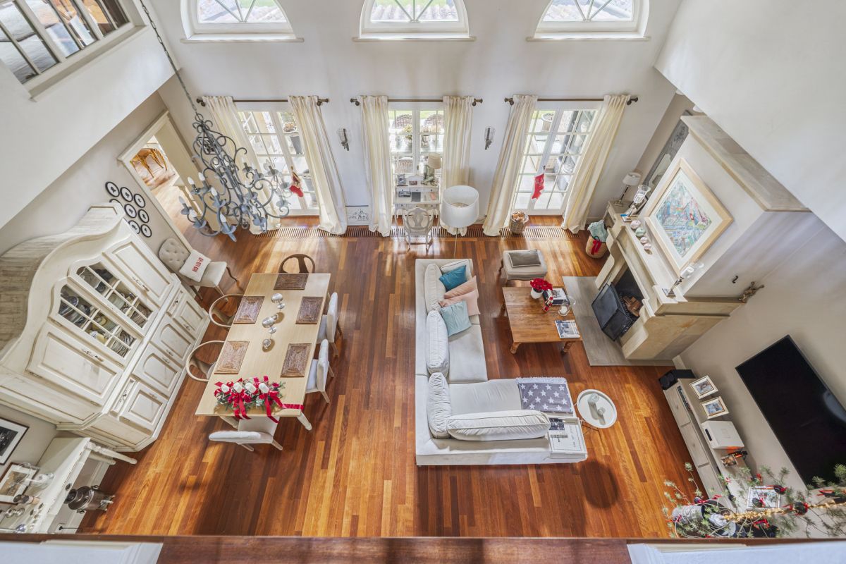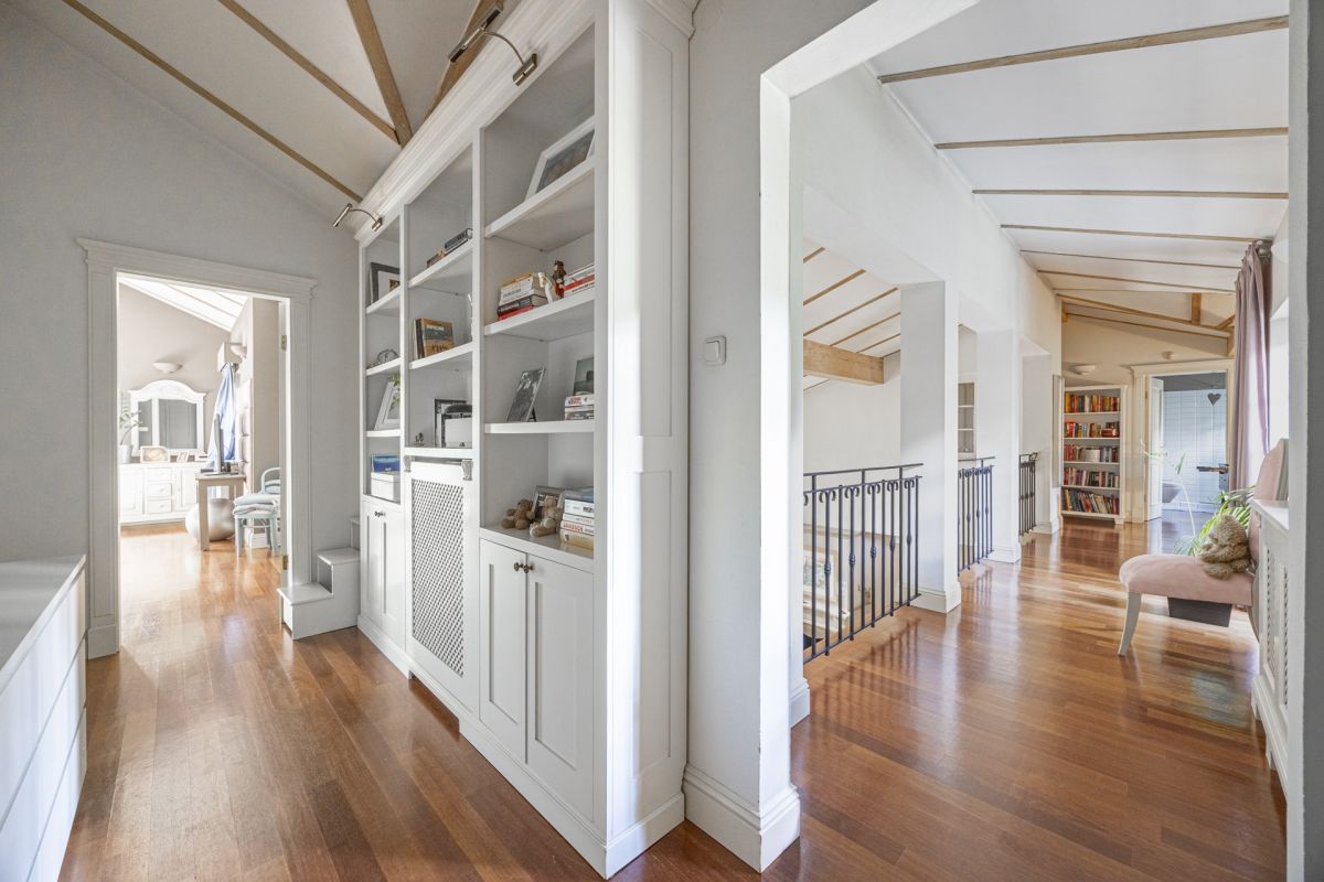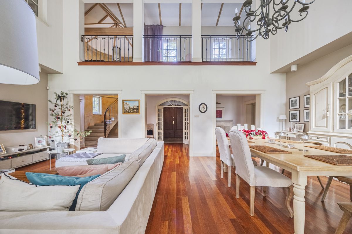 Wnętrza rezydencji zaprojektowano z wyraźną myślą o jakości, funkcjonalności. Naturalna deska podłogowa, kute balustrady wewnętrzne i zewnętrzne oraz drewniana stolarka okienna ze szprosami budują spójny, elegancki charakter przestrzeni. Kuchnia została wyposażona w indywidualnie projektowaną zabudowę z granitowymi blatami oraz sprzęt AGD marki SMEG, a łazienki wykończono ceramiką klasy premium renomowanych marek - Roca, Hatria oraz Villeroy & Boch. Komfort codziennego użytkowania podnoszą praktyczne rozwiązania, takie jak zsyp na pranie, zmiękczacz i filtr wody oraz ogrzewanie tarasu.
