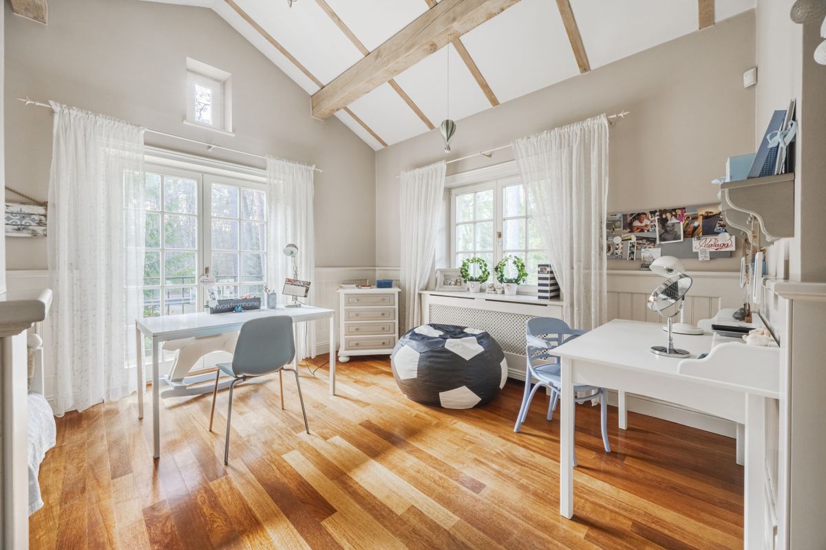 Piętro zostało wyraźnie podzielone na strefę prywatną właścicieli oraz część dziecięco-rekreacyjną, połączoną antresolą z salonem: