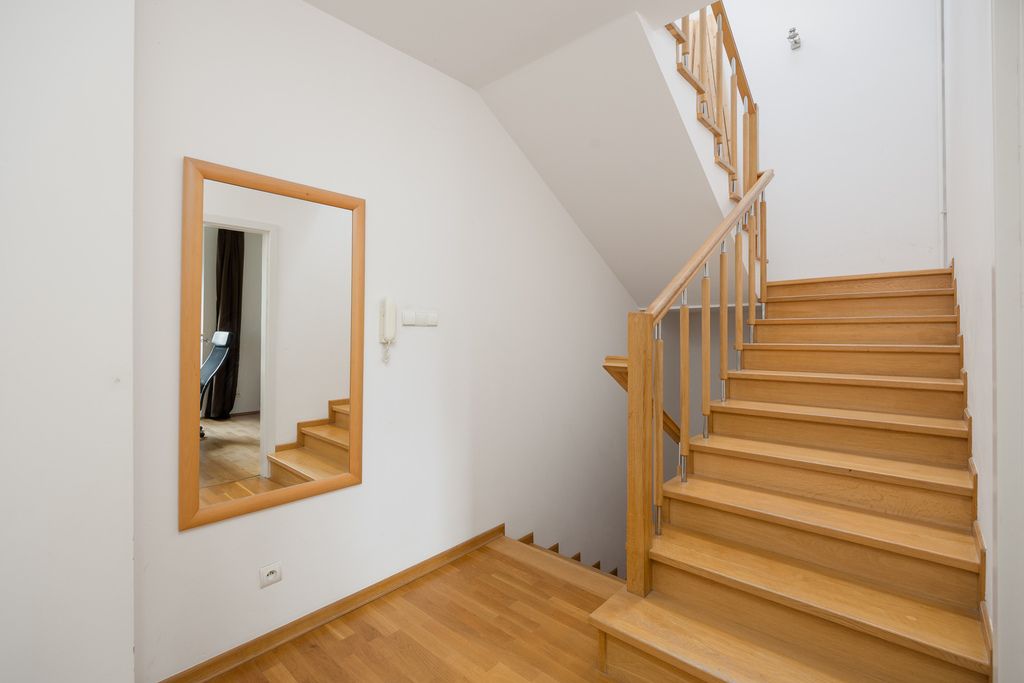 Wnętrza zostały wykończone z dbałością o detale i funkcjonalność. W salonie oraz na klatce schodowej zastosowano elegancką deskę podłogową, która dodaje wnętrzom ciepła i naturalnego charakteru. W pozostałych pomieszczeniach znajdują się panele oraz praktyczny gres, idealny do intensywnie użytkowanych stref.