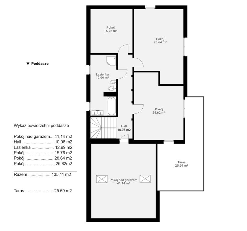 - Poddasze (Strefa Prywatna): Mieści trzy przestronne sypialnie (o powierzchniach 16m², 25 m² i 28 m²), dużą łazienkę (13 m²) oraz dodatkową przestrzeń nad garażem (41 m²), którą można zaadaptować na domową siłownię, pokój filmowy lub dodatkowy pokój hobby.