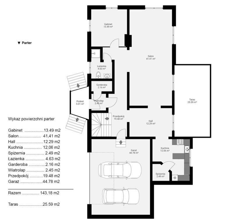 - Parter (Strefa Dzienna i Gościnna): To serce domu, gdzie przestronny salon z wydzielonym pokojem dziennym (łącznie 41 m²) sprzyja wspólnym chwilom. O ciepły klimat dba kominek z rozprowadzeniem ciepła. Jasna, ustawna kuchnia ze stylowymi, zadbanymi meblami i blatami z granitu łączy się z jadalnią, a przyległa spiżarnia gwarantuje wygodę. Na tym poziomie znajduje się również gabinet/ sypialnia (13 m²), łazienka i pojemny garaż (44 m²).