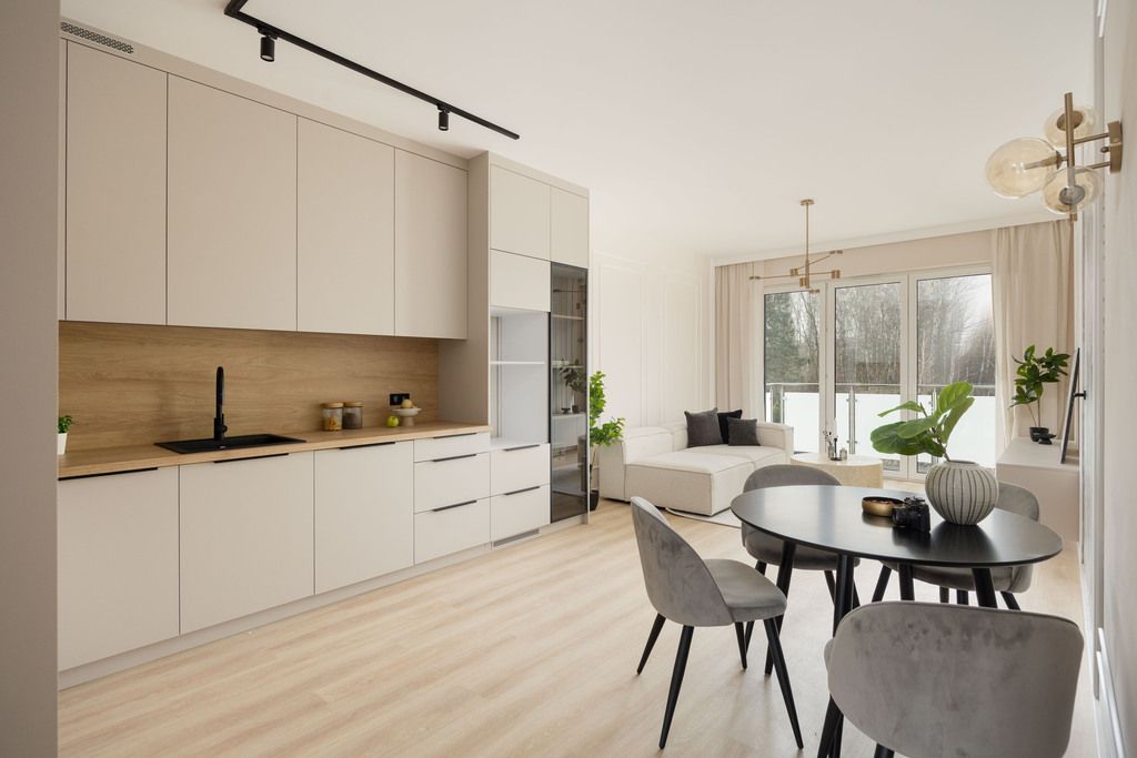 - Salon z aneksem kuchennym i wyjściem na balkon