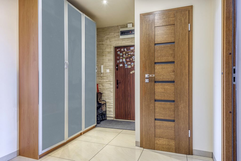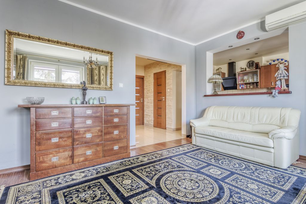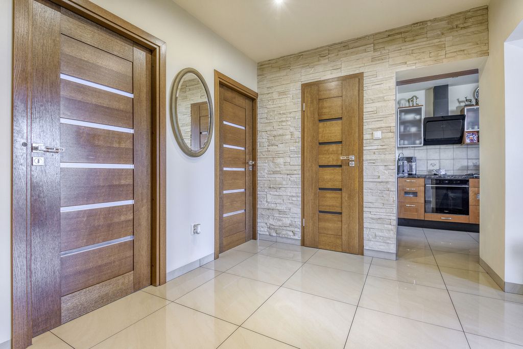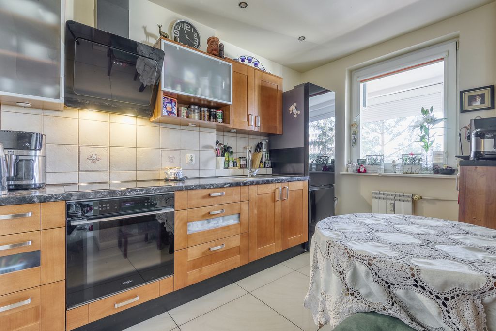 Okna PCV, na podłodze wysokiej klasy ścieralności panele i gres. Niemal wszystkie meble zostały wykonane na wymiar przez stolarza z wysokiej jakości naturalnego drewna, co nadaje wnętrzu unikalny charakter.