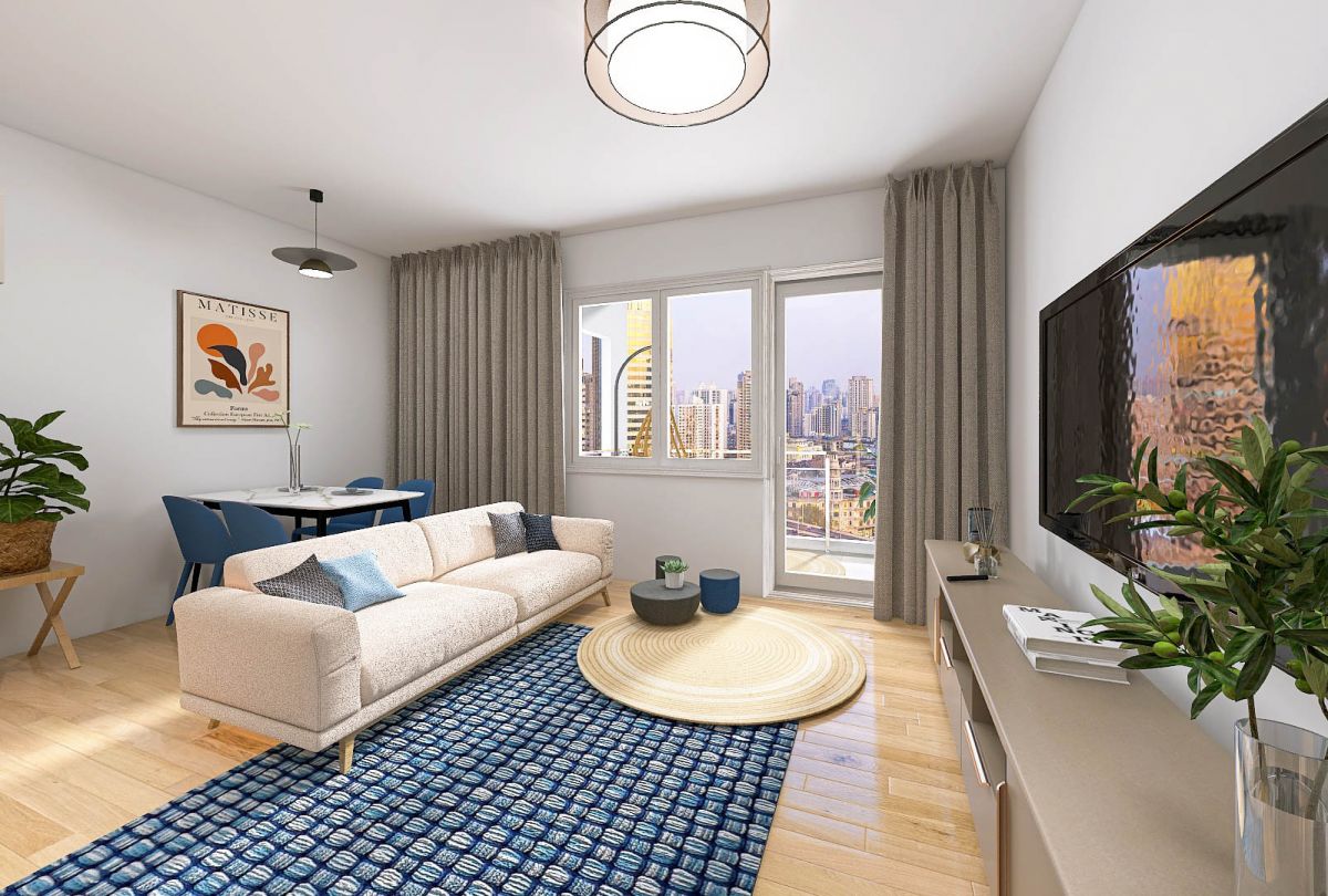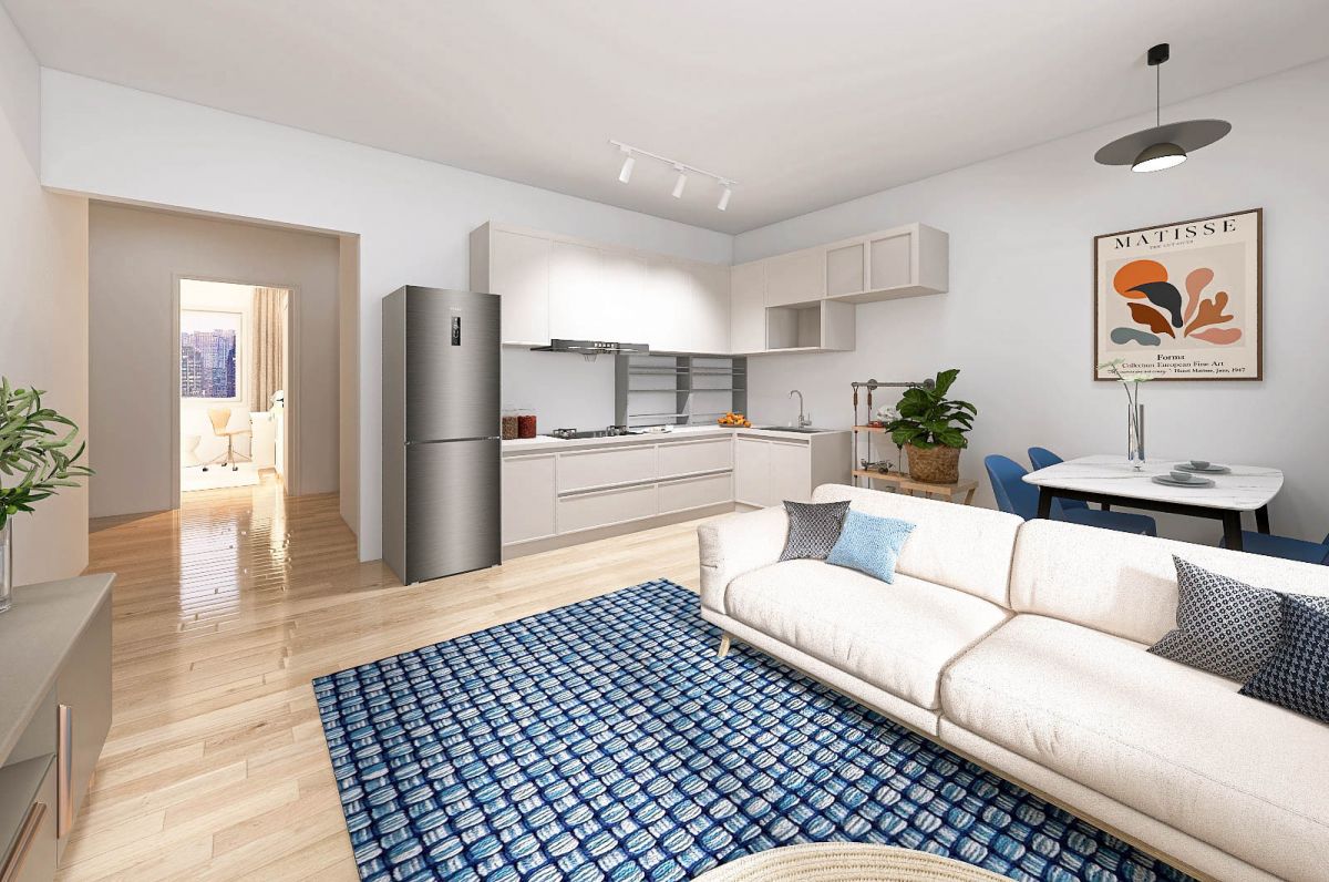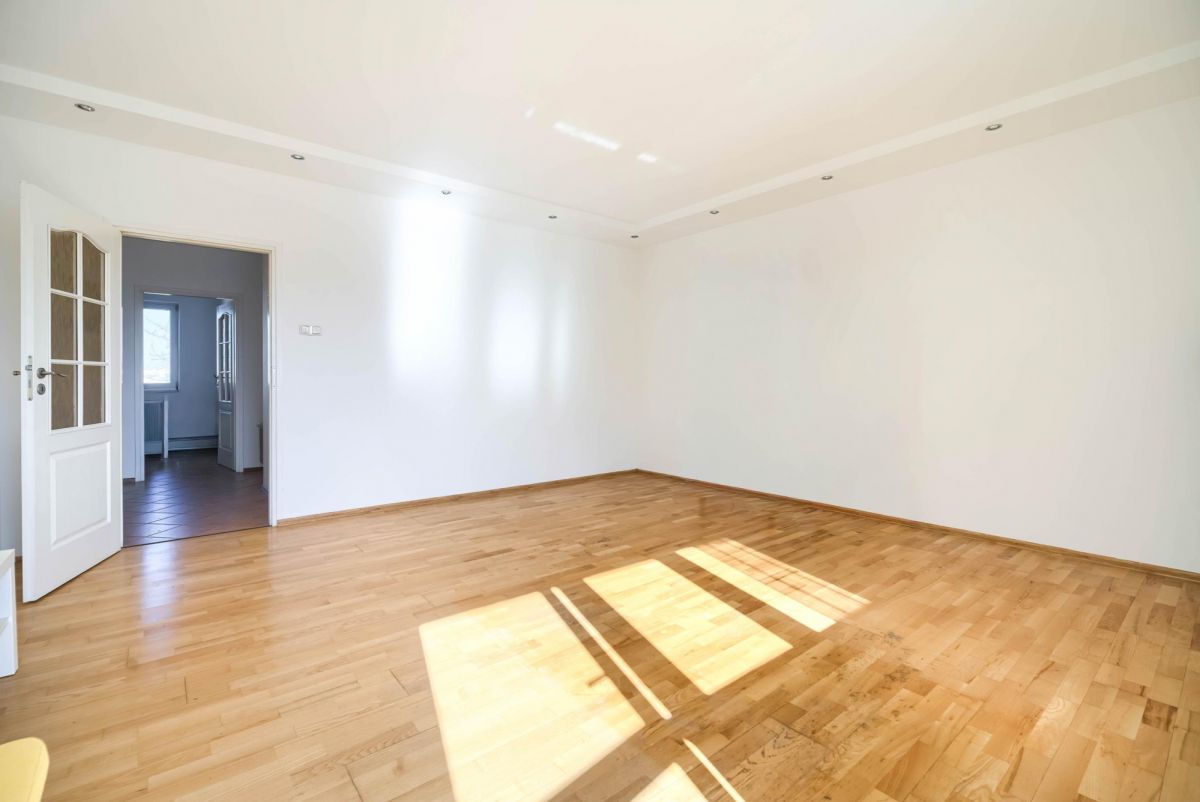 W salonie jest przestrzeń, aby zaaranżować aneks kuchenny i stworzyć funkcjonalne 3-pokojowe mieszkanie.