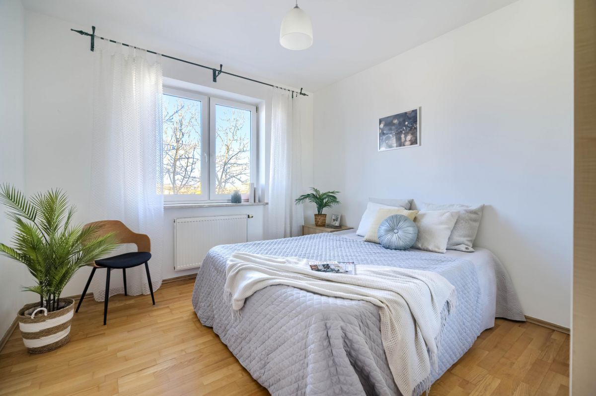 Sypialnia oraz kuchnia usytuowane są od cichej strony osiedla, co zapewnia komfort i spokój.