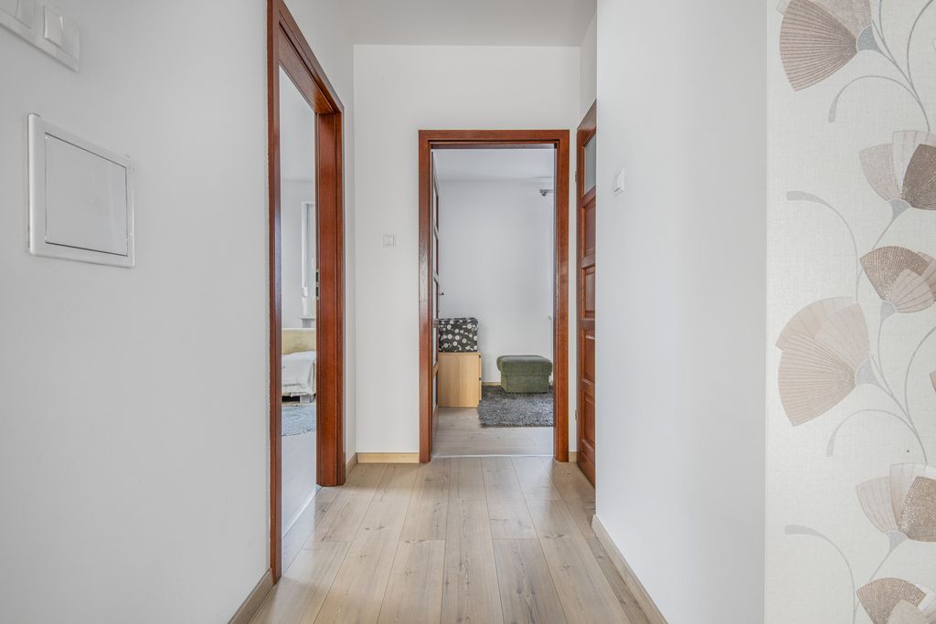 - przedpokój (9,94 m2)- na ścianie znajduje się tapeta z motywem miłorzębu japońskiego. Szafy w zabudowie wykonane na wymiar pomieszczą wszystkie najpotrzebniejsze rzeczy.