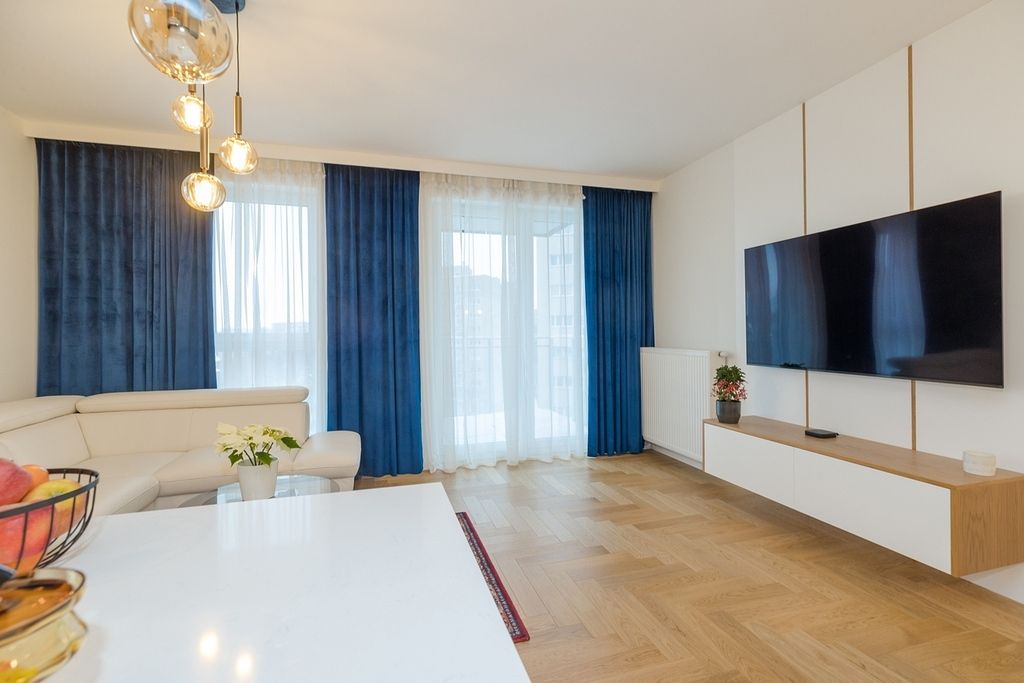 To wnętrze, które „wykończono dla siebie”, czyli bez żadnych kompromisów. Klasę materiałów widać i czuć w każdym detalu. O wysokim standardzie apartamentu świadczą m.in. klasyczny, ponadczasowy dębowy parkiet, zabudowa meblowa skrojona na miarę, kuchnia wyposażona w sprzęt marki Siemens (w tym ekspres do kawy w zabudowie oraz piekarnik z funkcją grilla i mikrofali), blaty oraz wyspa kuchenna wykonane z trwałego i eleganckiego spieku.