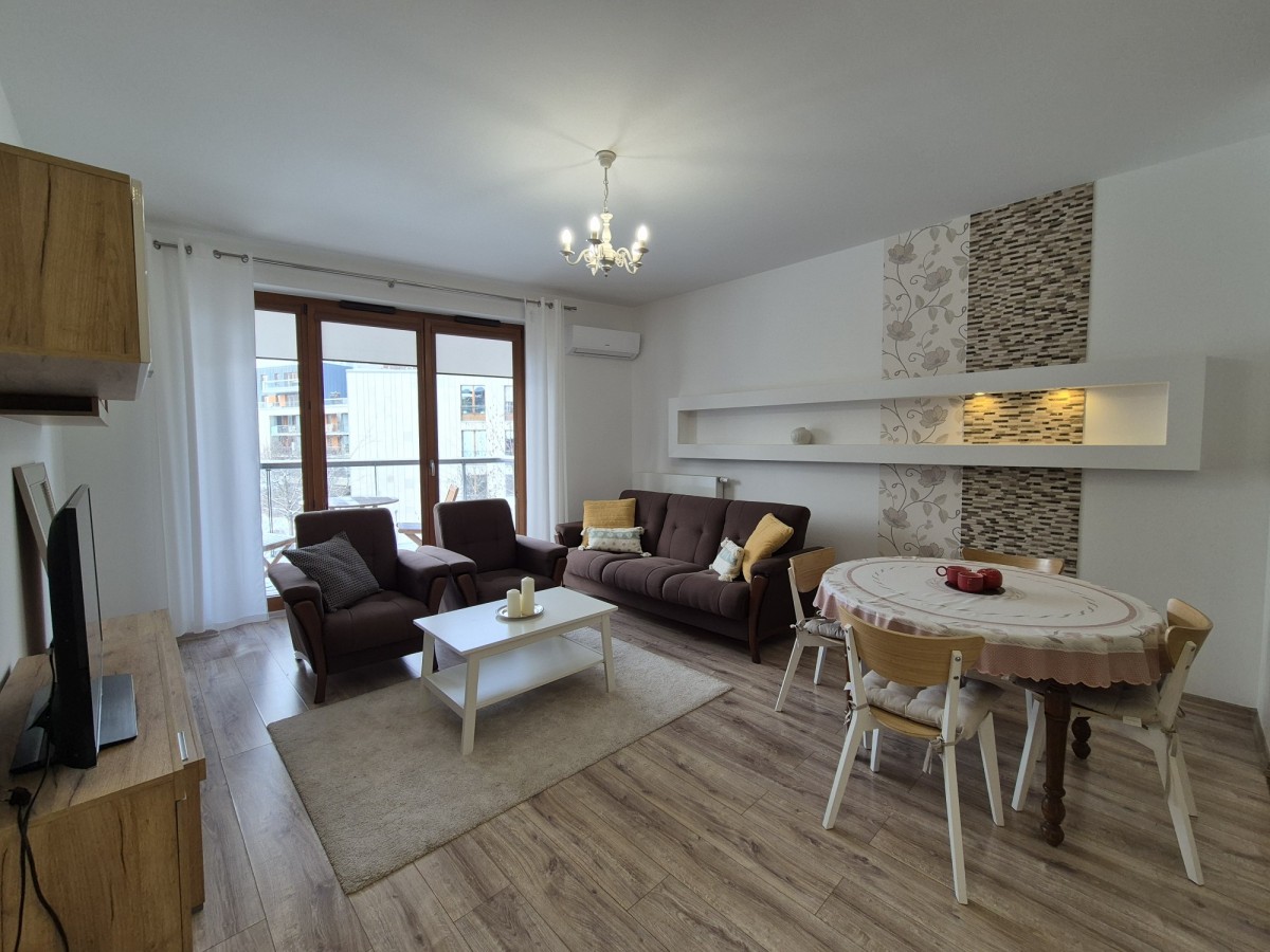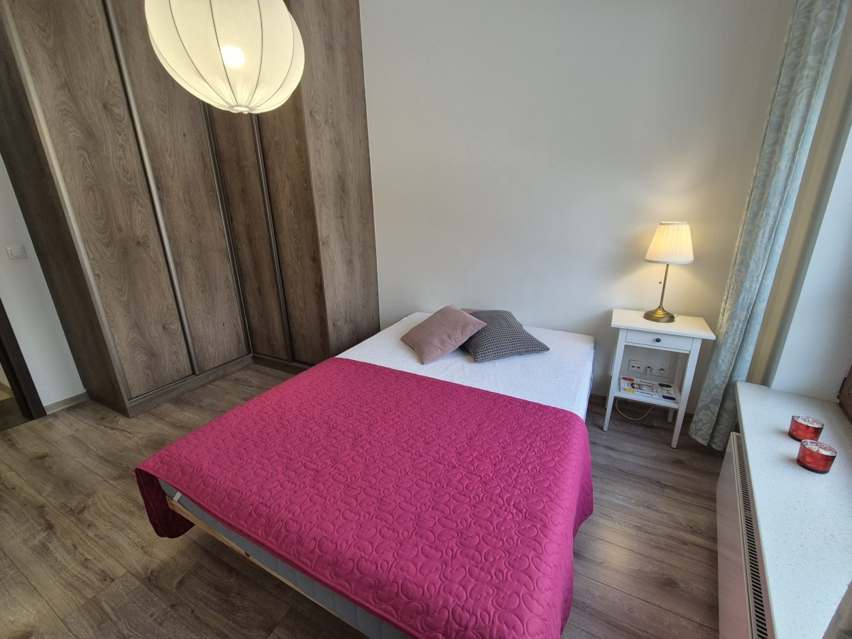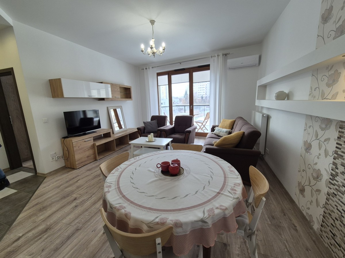 - umeblowanego pokoju dziennego połączonego z w pełni wyposażoną kuchnią i wyjściem na spory balkon z widokiem na zieleń (w salonie klimatyzacja),