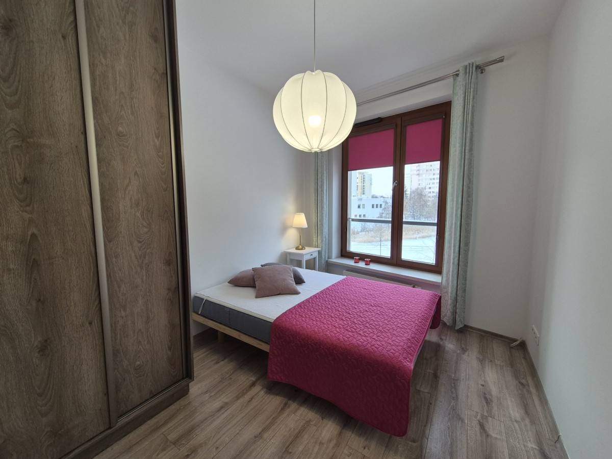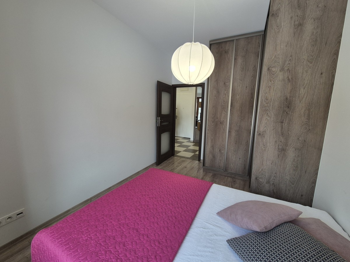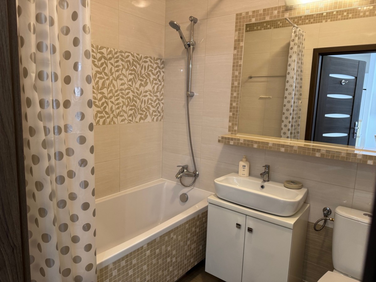 - umeblowanego pokoju dziennego połączonego z w pełni wyposażoną kuchnią i wyjściem na spory balkon z widokiem na zieleń (w salonie klimatyzacja),