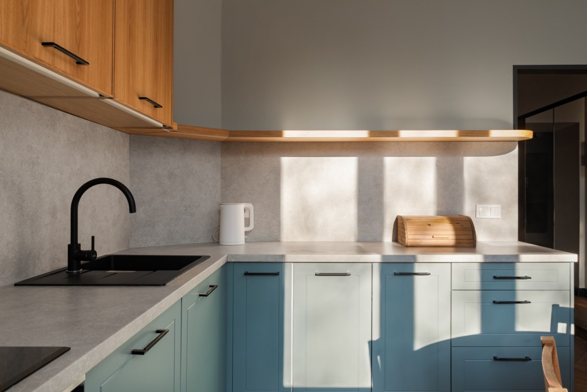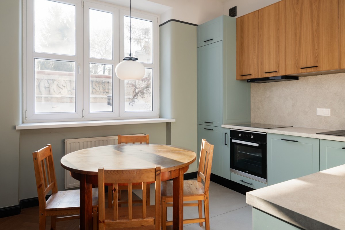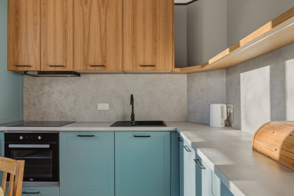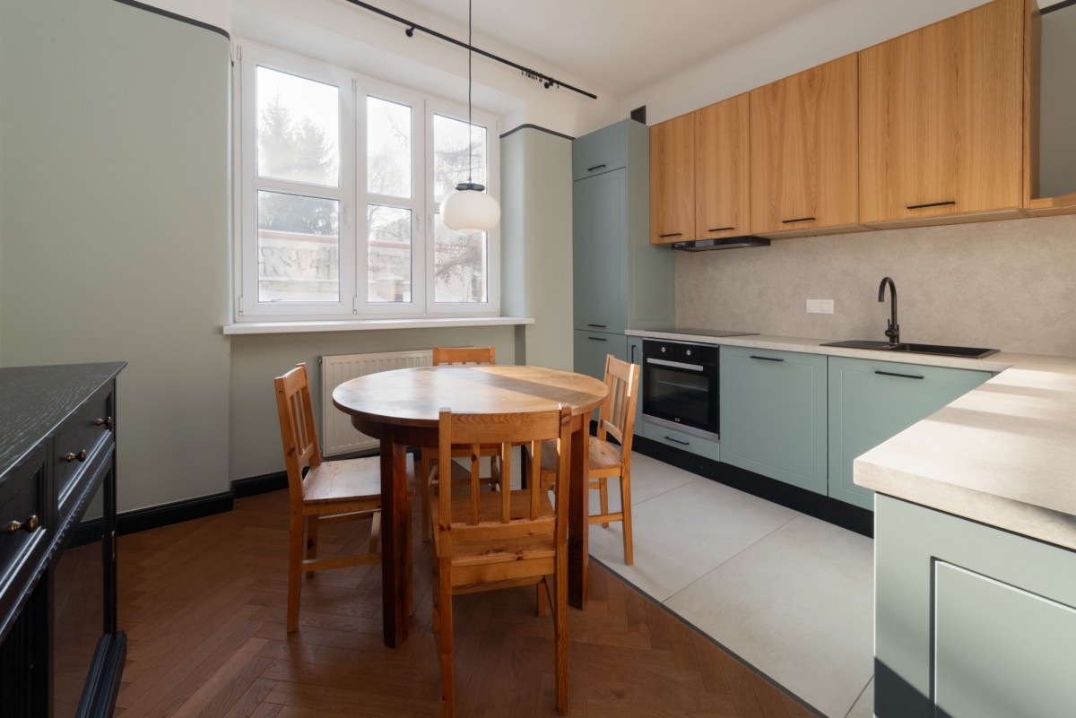 - Kuchnia - w pełni wykończona, z nowoczesną zabudową w odcieniach zieleni i drewna, płytą indukcyjną, piekarnikiem, czarną armaturą i eleganckim wykończeniem powierzchni roboczej.