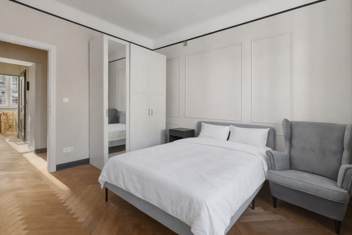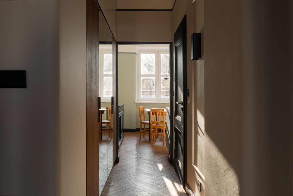 Mieszkanie o wyjątkowym charakterze, usytuowane na 1. piętrze przedwojennej kamienicy z 1937 roku. Składa się z dwóch niezależnych pokoi, osobnej kuchni, łazienki oraz przedpokoju z pojemną szafą w zabudowie. Dzięki układowi mieszkania oba pokoje mogą pełnić funkcję sypialni lub zostać zaaranżowane jako sypialnia i przestrzeń dzienna.