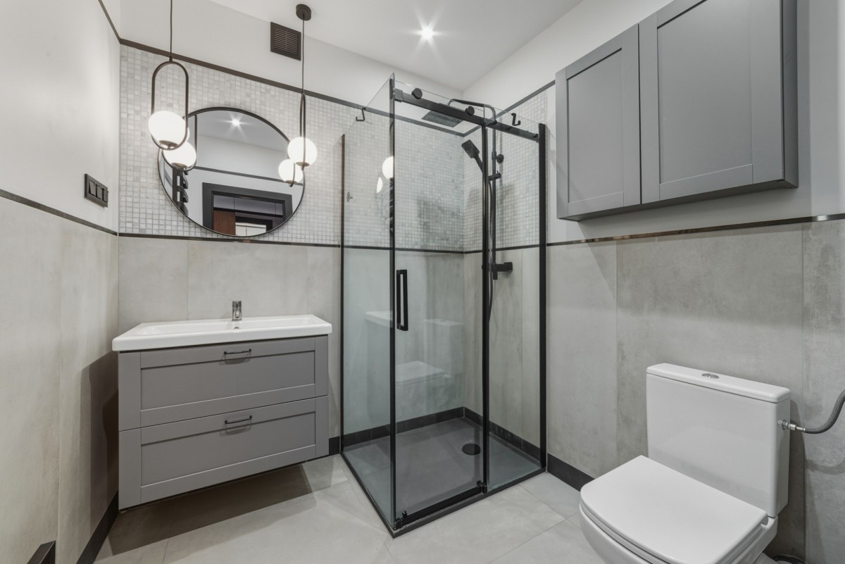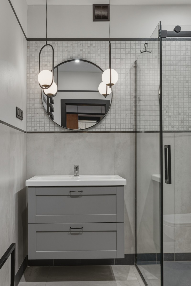 - Łazienka - wykończona w spójnej stylistyce, z kabiną prysznicową, szafką pod umywalką, okrągłym lustrem oraz charakterystycznym oświetleniem w formie wiszących kul.