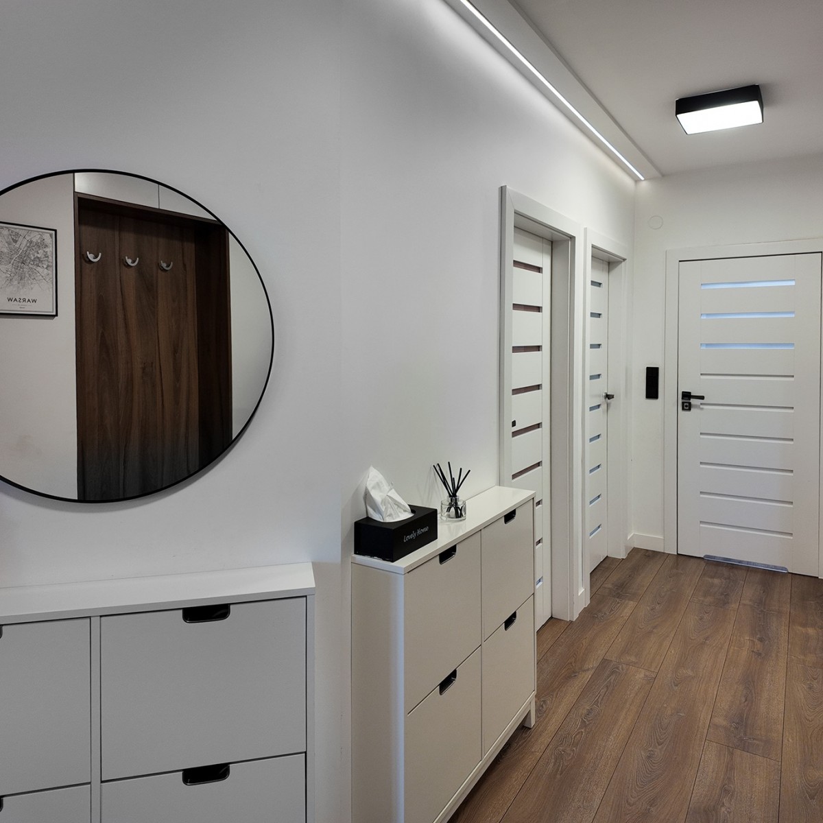 Układ mieszkania jest przemyślany i bardzo wygodny, z wyraźnym podziałem na strefę dzienną i prywatną — idealny dla rodzin.