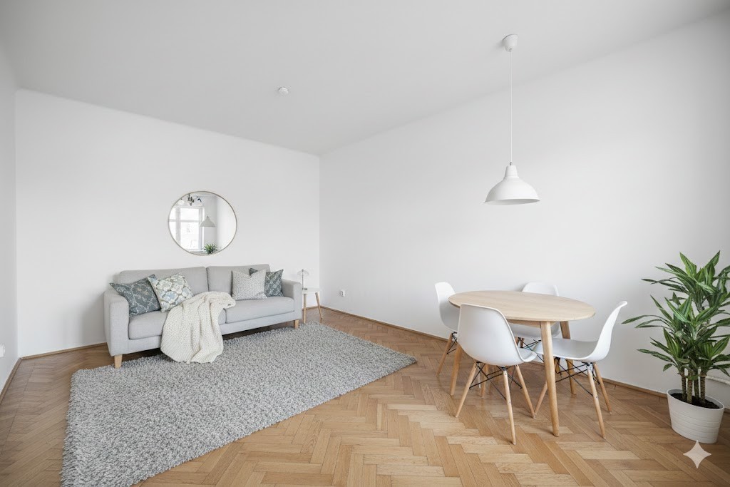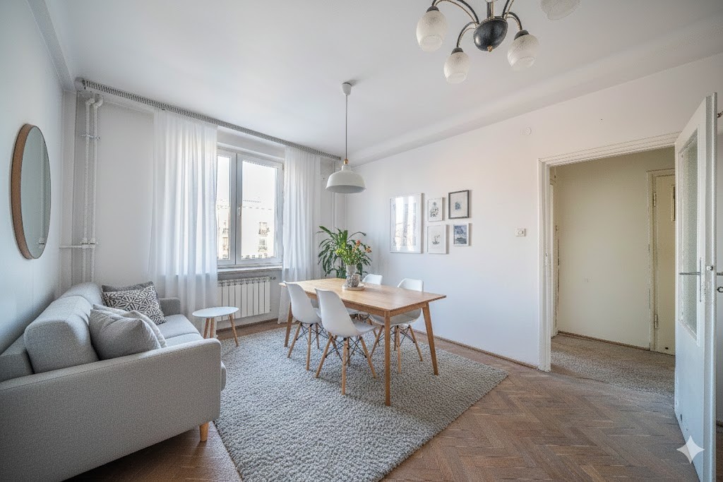 Układ: Duży salon (~20 m²), widna kuchnia (~10 m²), łazienka oraz przedpokój.