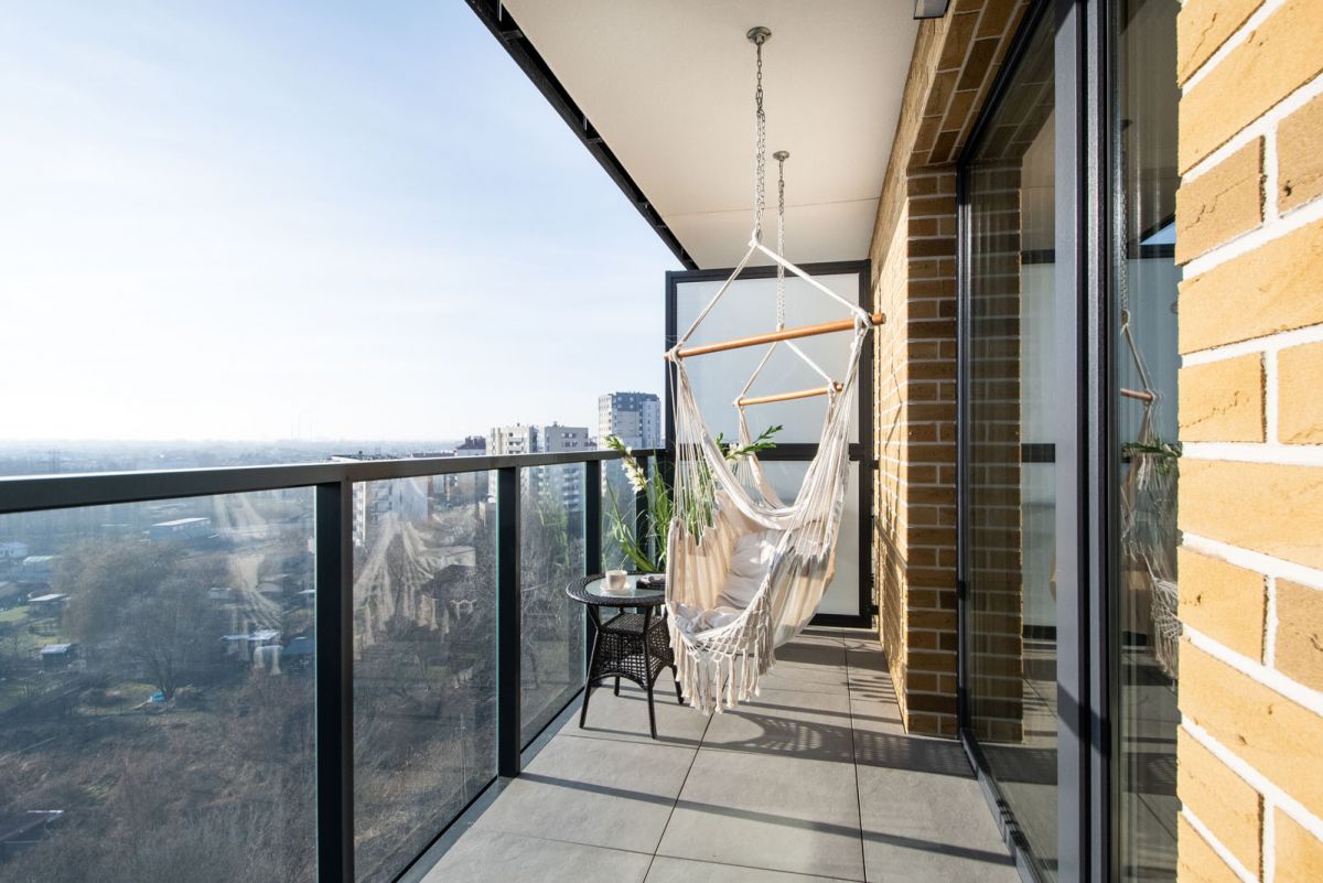 Lokal znajduje się na 9 piętrze i posiada spory balkon z hamakami.
