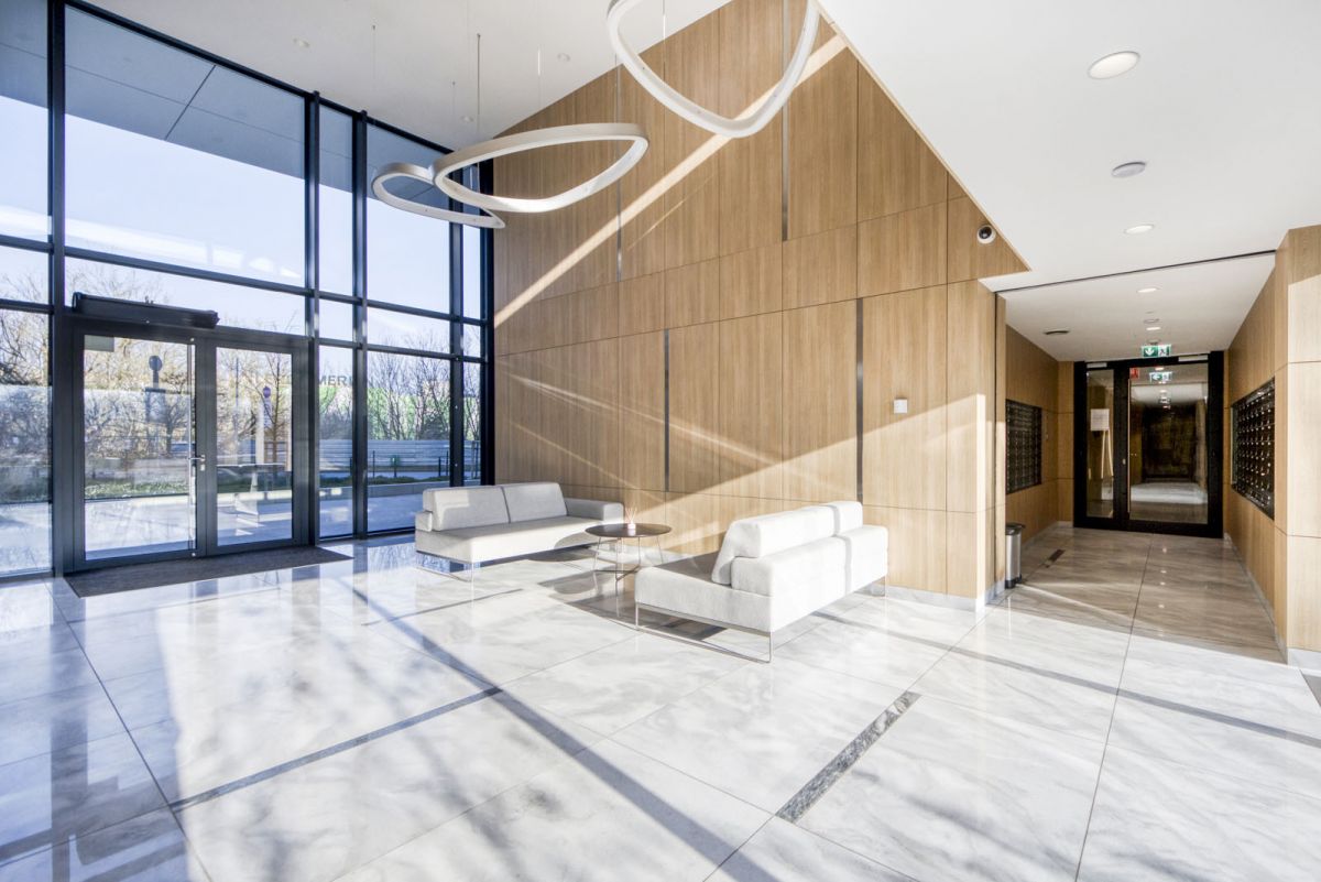 Na dole wysoki, reprezentacyjny hol z recepcją oraz monitoringiem, na której kurier może zostawić przesyłkę.