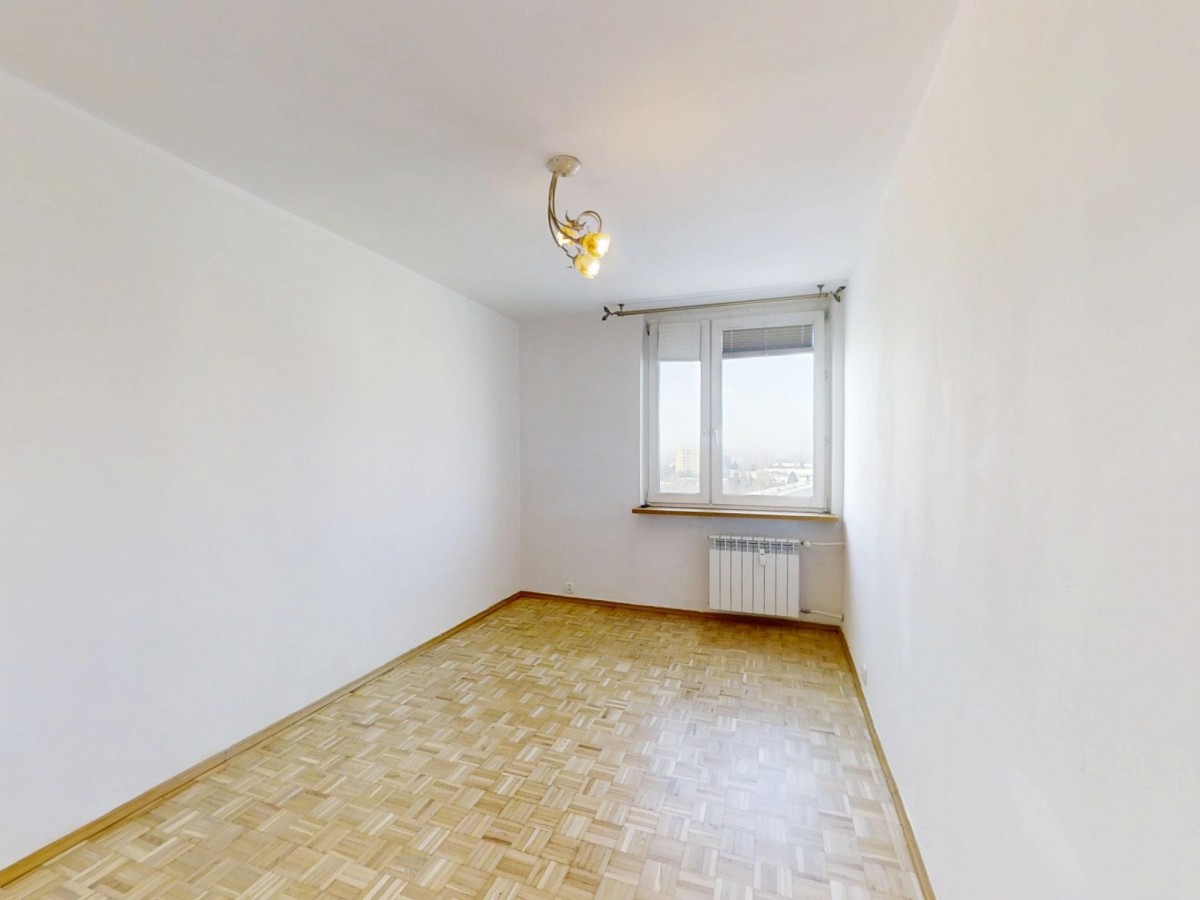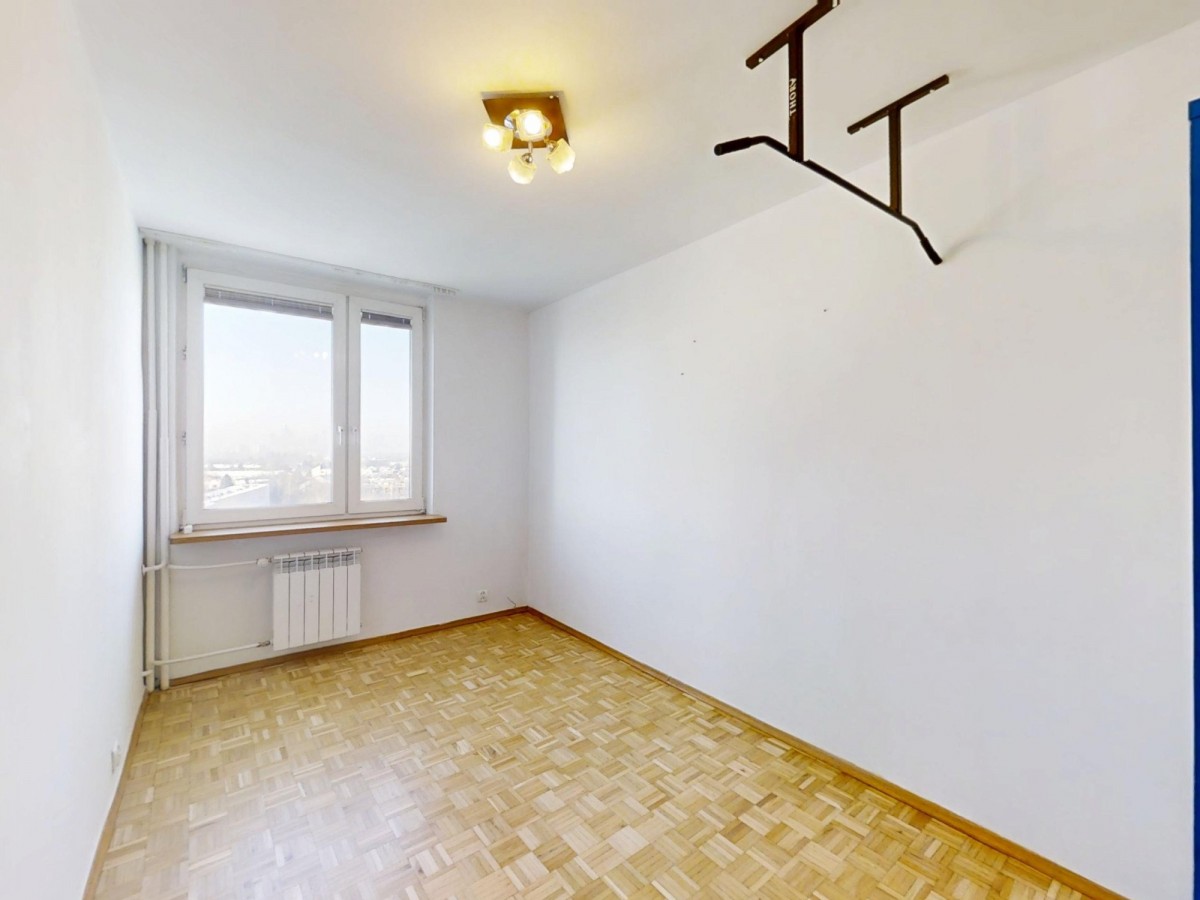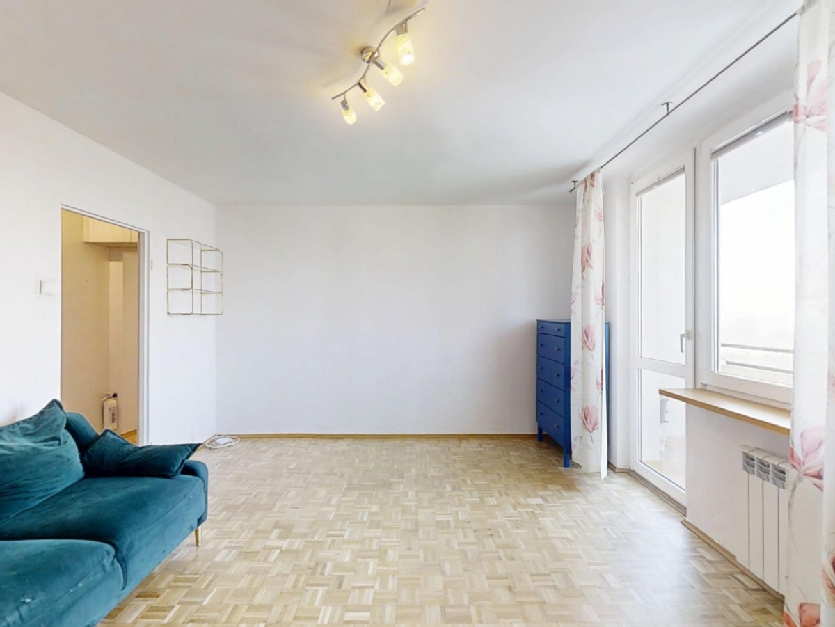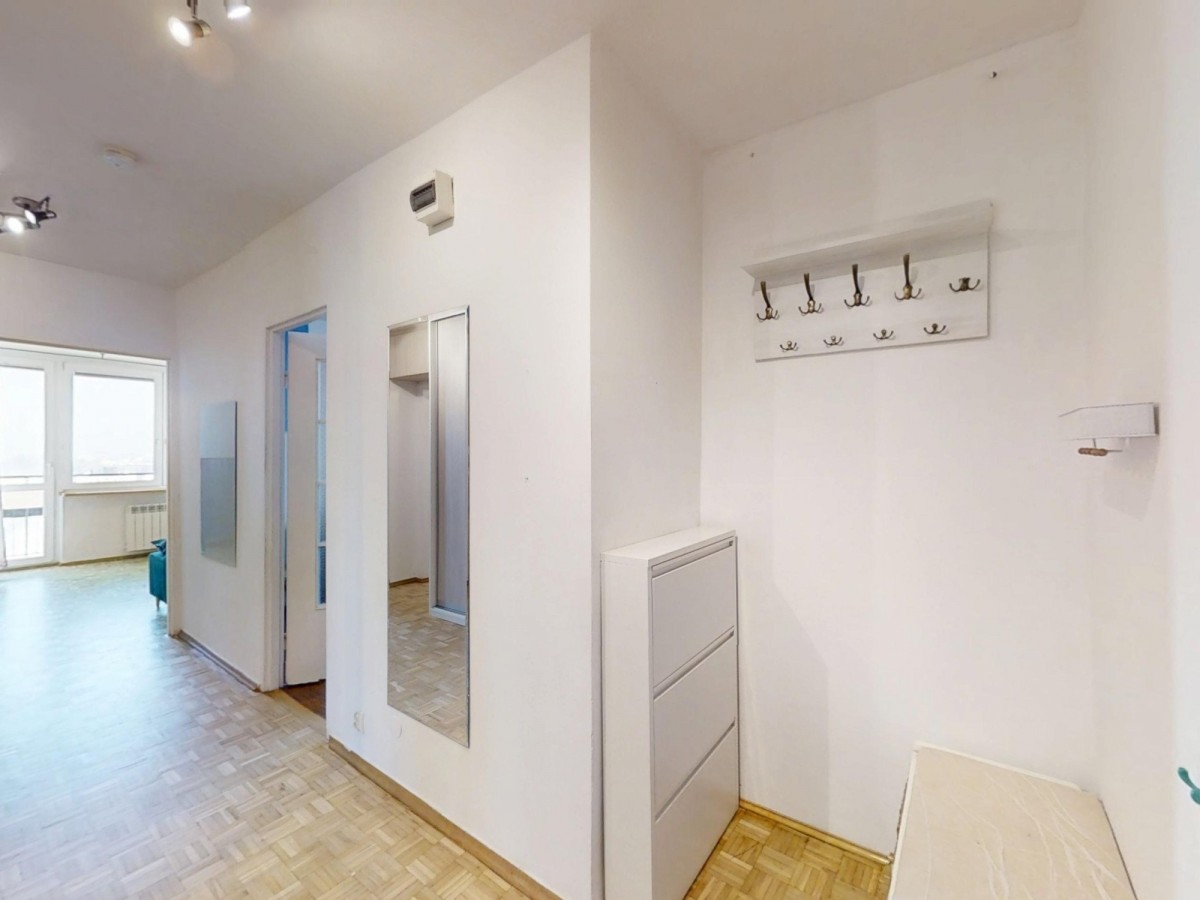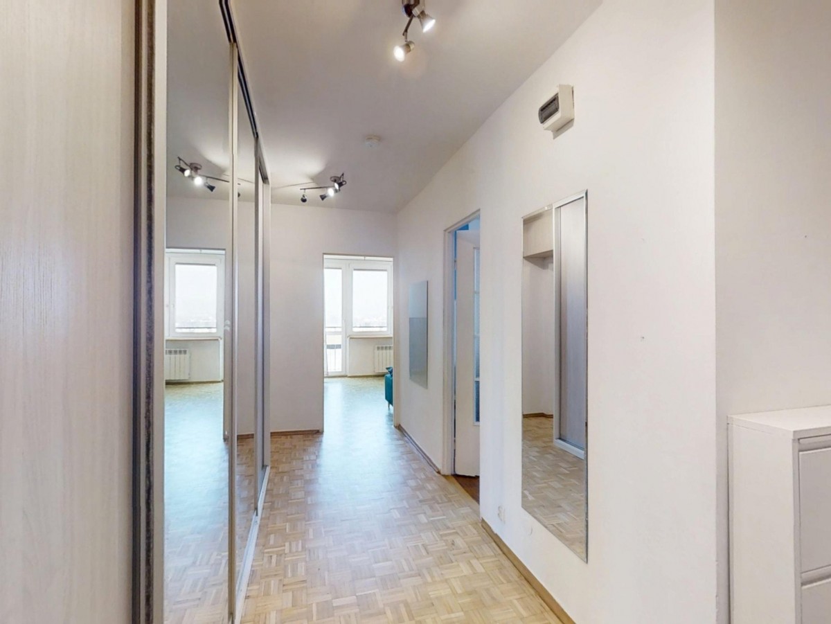 - słonecznego salonu z wyjściem na duży balkon i widokiem na centrum Warszawy