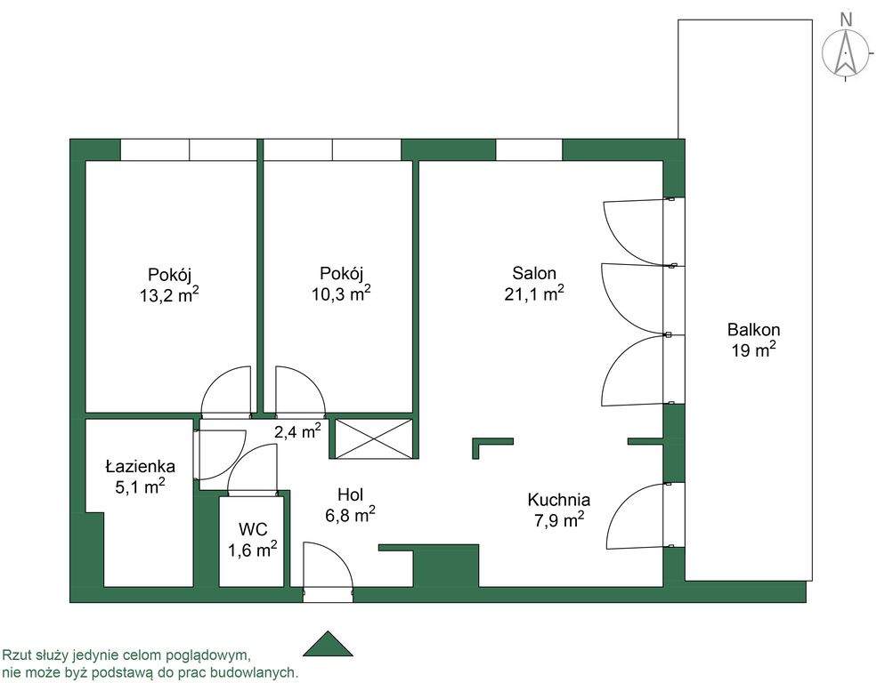 - Salon(21,1 m2) z aneksem kuchennym(7,9m2) - (wyjście na duży balkon 19 m2)