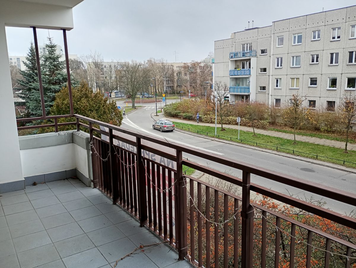 Duża, zadaszona loggia z widokiem na spokojną uliczkę Surowieckiego.