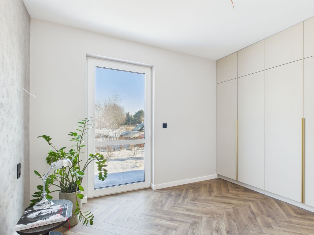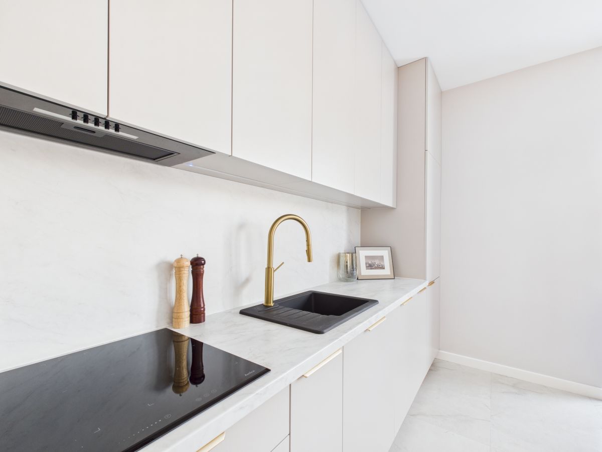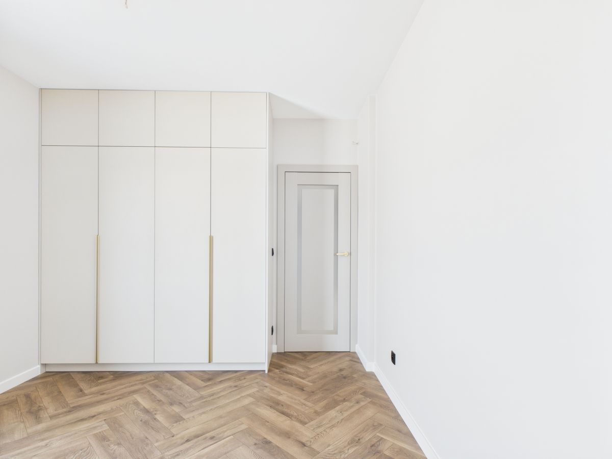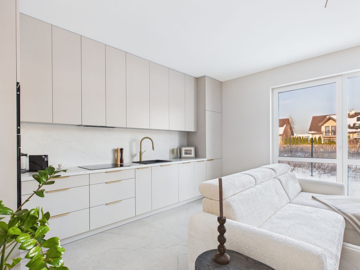 - Zabudowa kuchni i szafa w sypialni wykonane na zamówienie z tych samych materiałów - spójna i elegancka aranżacja