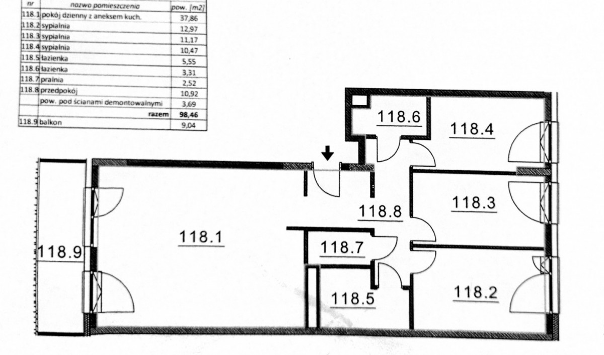Całkowita powierzchnia mieszkania wynosząca 98,5 m2 została funkcjonalnie podzielona na :