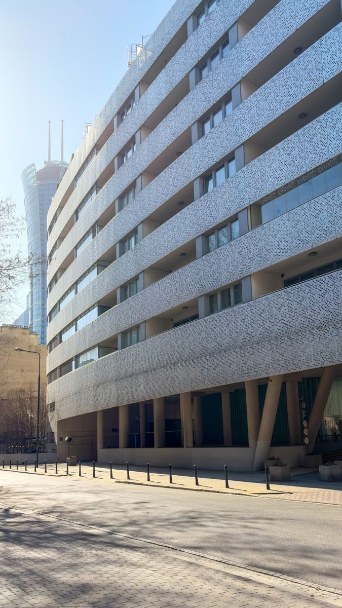 Duża loggia od strony południowej zapewnia przyjemną przestrzeń do odpoczynku z widokiem na patio oraz panoramę budynków przy Pl. Europejskim.