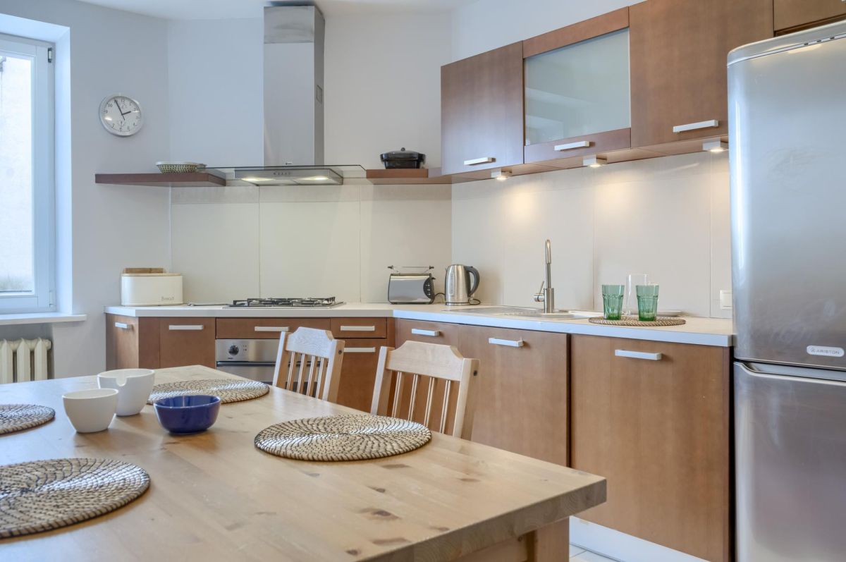 Oddzielna kuchnia z oknem wyposażona jest we wszystkie niezbędne sprzęty AGD (zmywarka, lodówka, kuchenka gazowa, piekarnik, kuchenka mikrofalowa, pralka), oraz pełną zastawę kuchenną. Jest tu również duży stół, przy którym swobodnie usiądzie nawet do 6 osób.