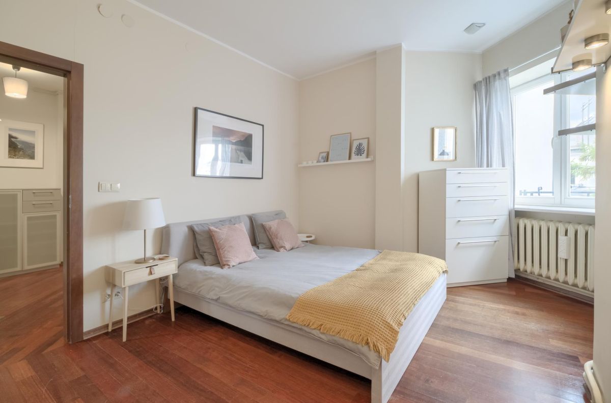 Przytulna sypialnia od strony wewnętrznego dziedzińca kamienicy jest cicha i ma widok na zieleń. Jest tu podwójne łóżko ze stolikami nocnymi, komoda oraz na całej ścianie bardzo pojemna szafa.
